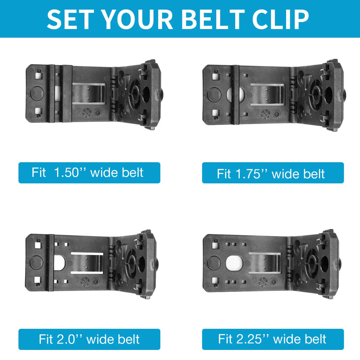 【Se adapta a cinturones de 1,5 pulgadas, 1,75 pulgadas, 2,0 pulgadas y 2,25 pulgadas de ancho】 El clip para cinturón es ajustable para adaptarse a cinturones de 1,5 pulgadas, 1,75 pulgadas, 2,0 pulgadas y 2.25 pulgadas de ancho.Consulte las instrucciones proporcionadas dentro del paquete para ajustar el clip del cinturón.