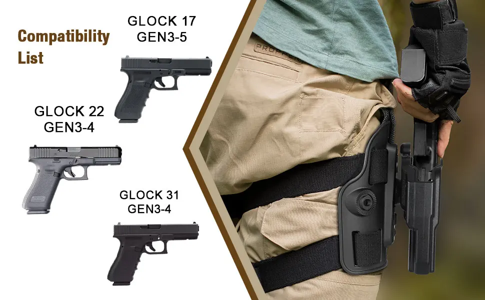 Material de alta calidad: la plataforma de la funda G17 con patas caídas está hecha de polímero de alta calidad, suave, resistente al desgaste y no se raya fácilmente.La correa de ajuste está hecha de material de alta elasticidad y alta viscosidad, lo que aumenta la vida útil del producto.