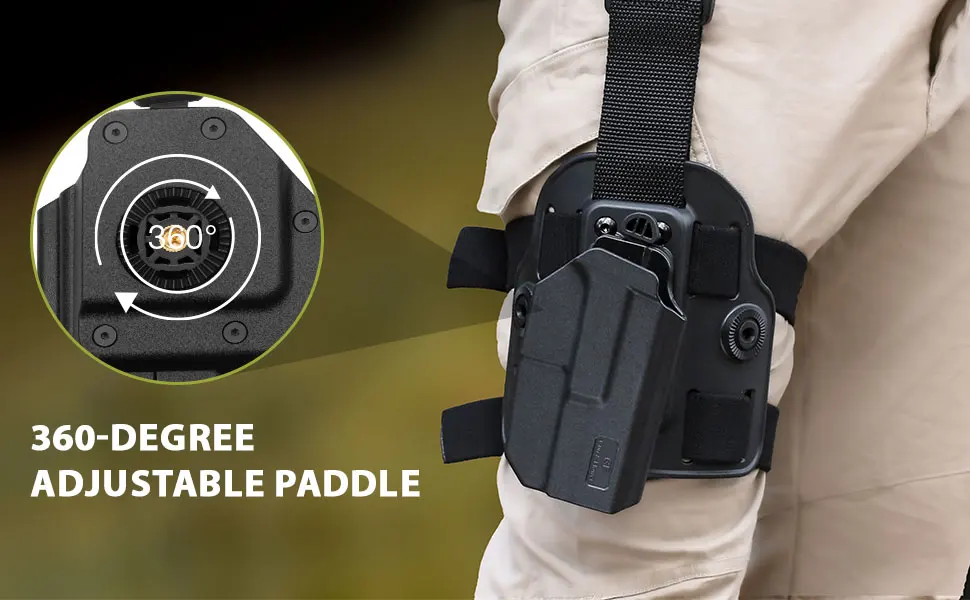 RETENCIÓN NIVEL II: esta funda para muslo ofrece retención de nivel II. Puede llevar esta funda para pierna caída a su pierna derecha y usar la funda con liberación del pulgar de la mano derecha según sus preferencias.Esta funda puede darle acceso exclusivo a sus pistolas y evitar que otras tomen su arma.