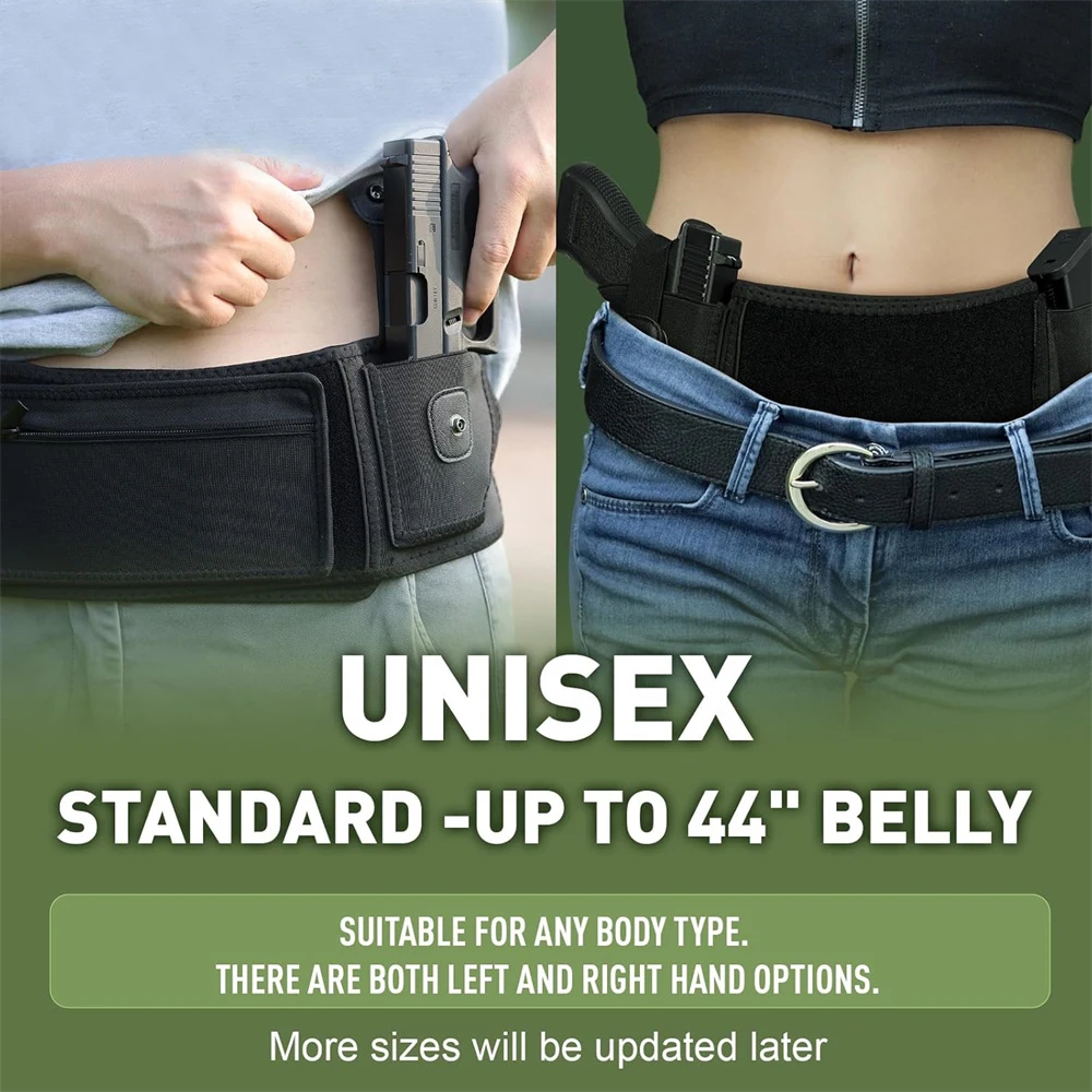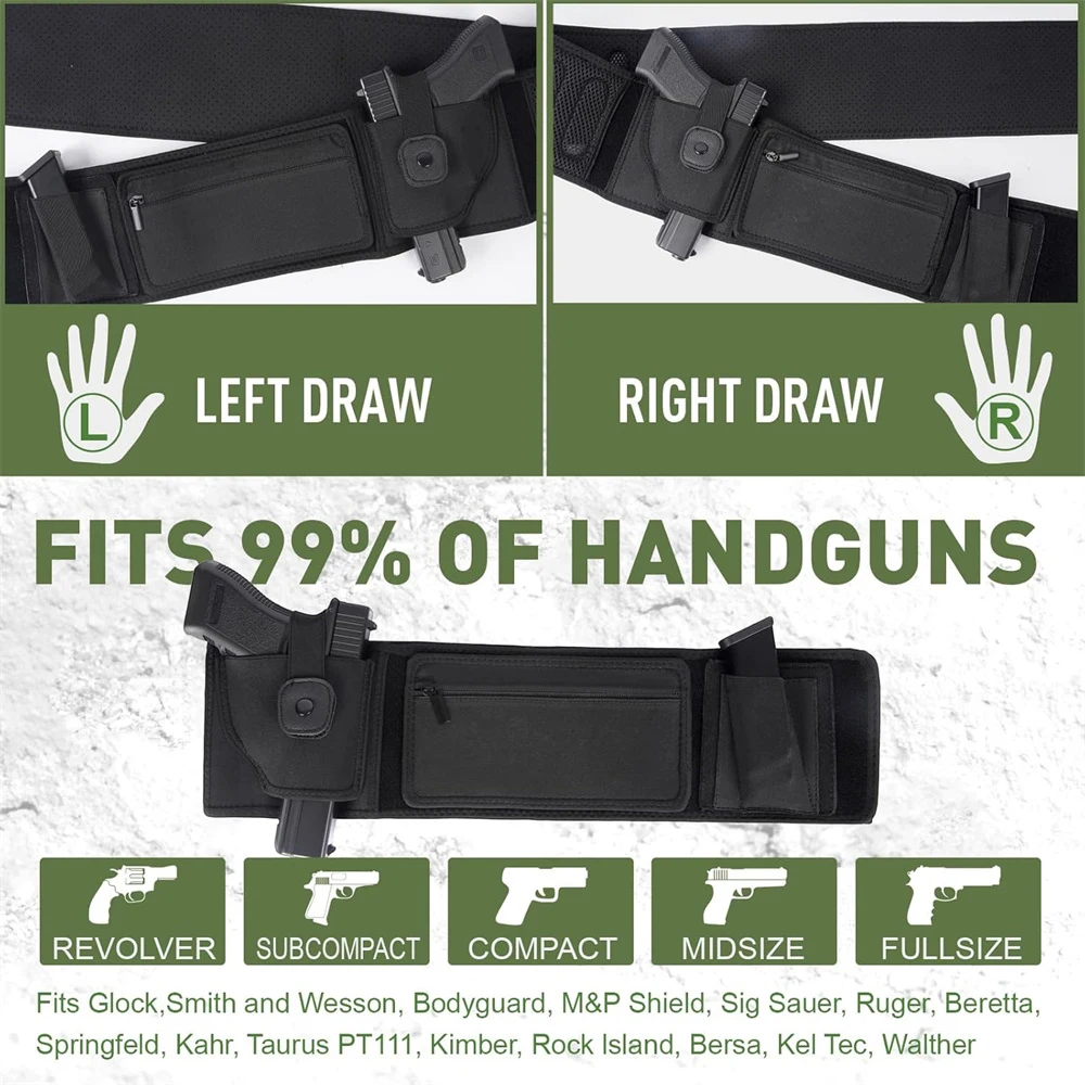 Fundas para Belly Band para hombre y mujer, disponibles en modelos izquierdo y derecho, compatibles con Glock 43x, 17, 19, 23, 38, 42, 43, Ruger, Smith & Wesson, Bodyguard, M&P Shield, Sig Sauer, Revolver, Kahr, Beretta, Springfield, Hellcat, Taurus, Kimber, Rock Island, Bersa, Kel Tec, Walther y pistolas de 9 mm.No apto para sistemas láser e de iluminación.