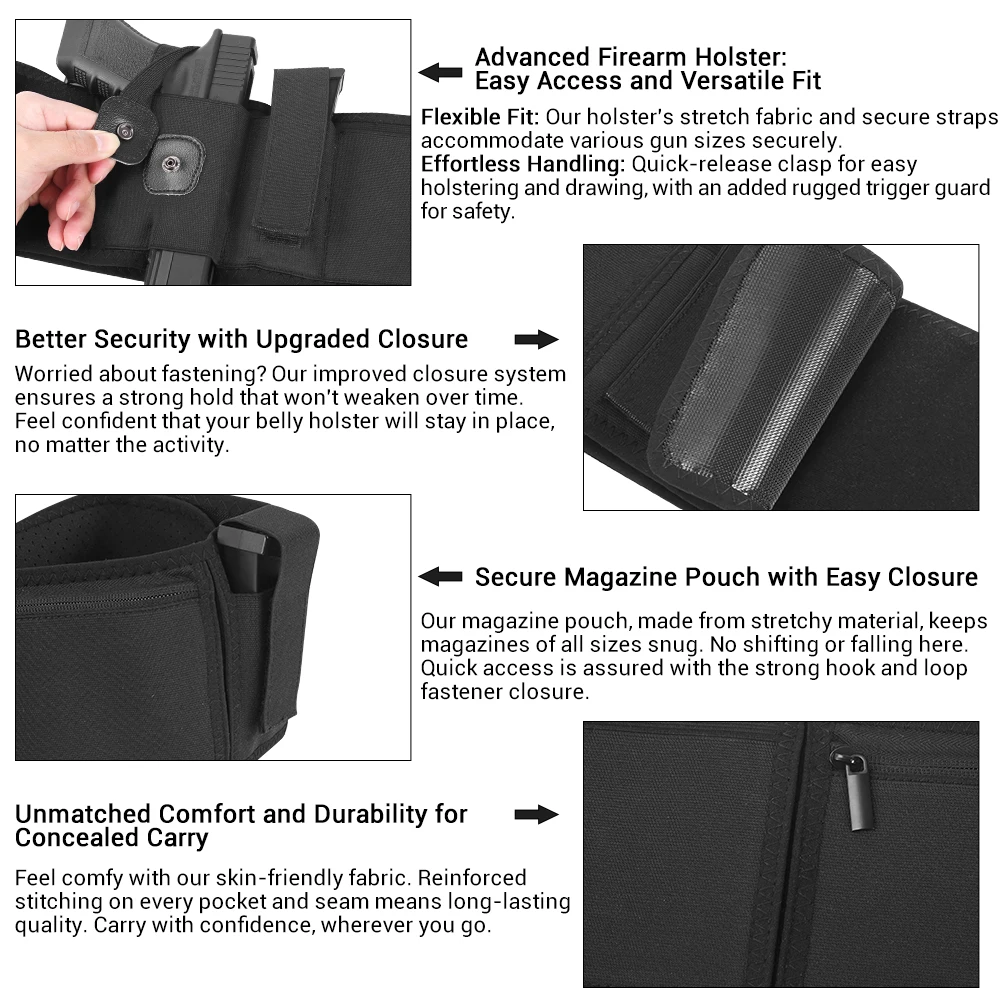 1.【Rapid Access,Secure Fit】Our upgraded hook-and-loop fastener material provides a stronger, longer-lasting grip. With a trigger guard, this belly band holster for concealed carry features a snap-on button retention strap, ensuring a secure, rapid, snag-free handgun draw. The extended, wider magazine retention strap keeps your magazine firmly in place, preventing slips and spills.