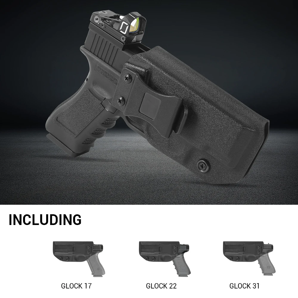 1. 【Material Kydex de primera calidad】 Fabricada con precisión utilizando material Kydex y polímero de alta calidad, esta funda Glock está diseñada específicamente para dibujar con la mano derecha.Su excepcional moldeado de precisión garantiza un ajuste perfecto para los modelos Glock 17, 22,31.Esta funda satisface sus necesidades de transporte discreto de armas y combina perfectamente con la óptica.Nota: Los accesorios láser/luz no son compatibles con esta funda.