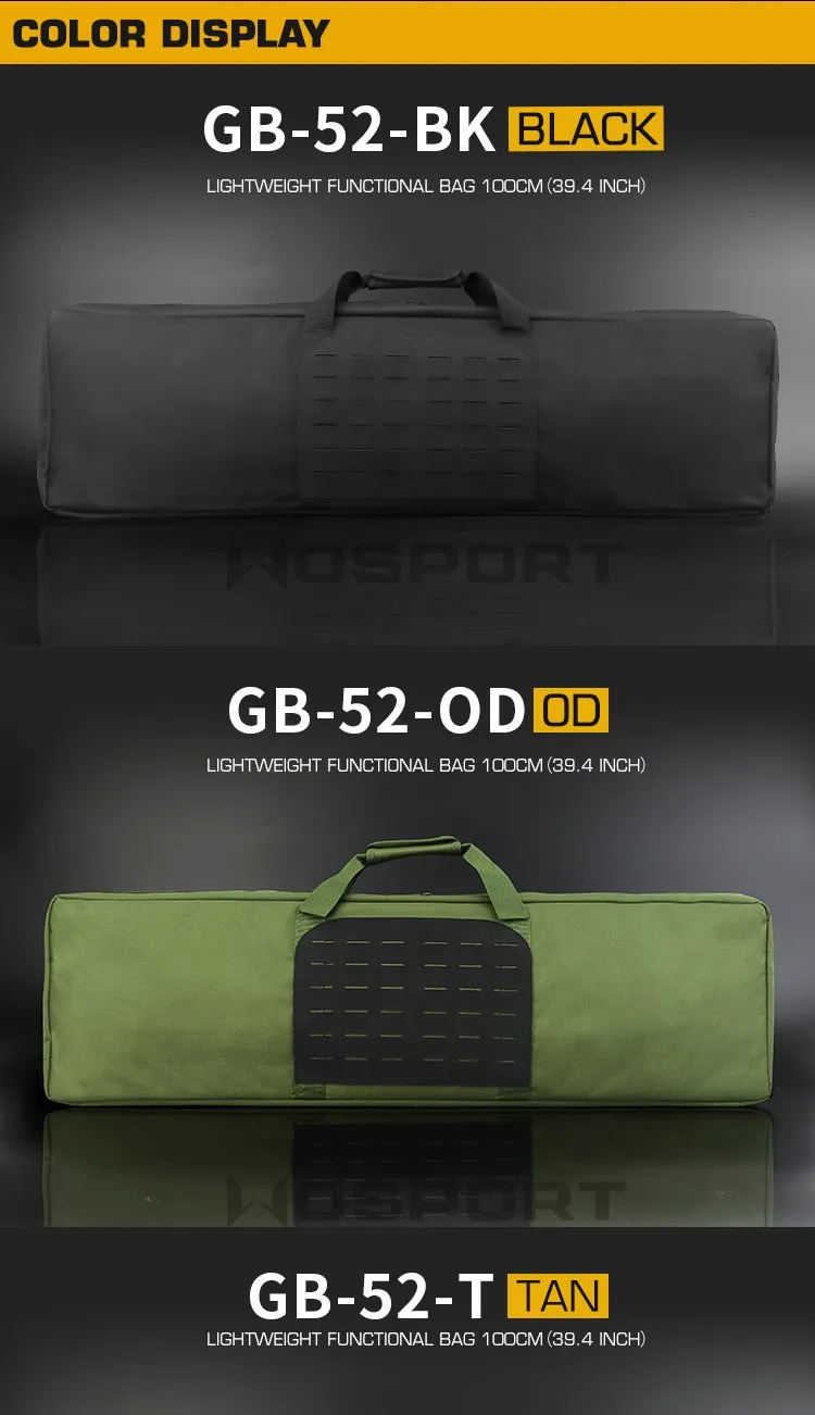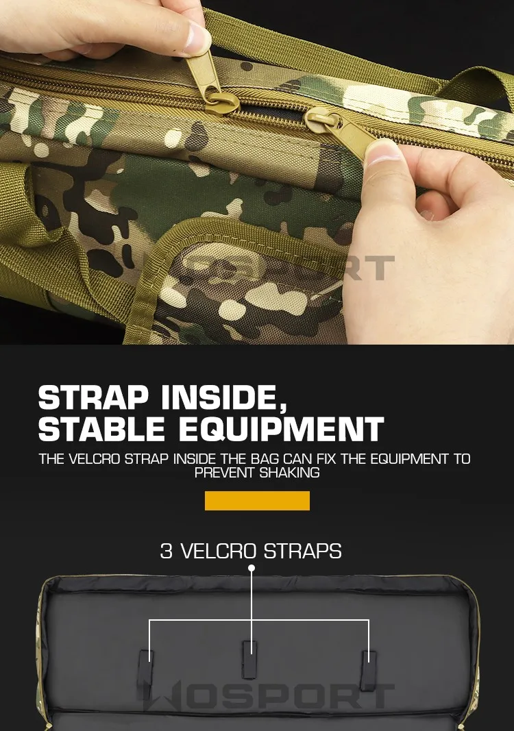 -- Material: nylon exterior 600D, Nylon interior 210D. -- Color del producto: negro, tostado, verde, CP -- Peso bruto: 790g -- Tamaño: 100*28*8cm