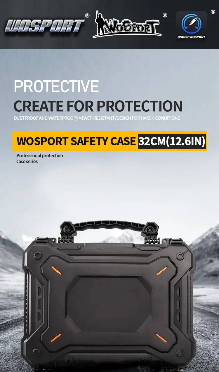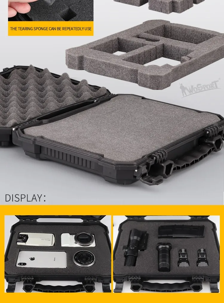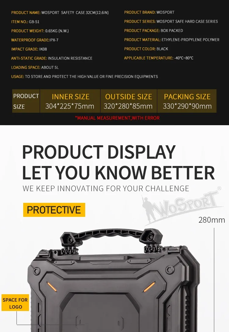Material: polímero de etileno-propileno Color: negro Peso: 0,75 kg Espacio de carga: aproximadamente 5L Tamaño: tamaño interior: 304*225*75mm/tamaño exterior: 320*280*85cm Uso: para almacenar y proteger equipos de alto valor o precisión fina.
