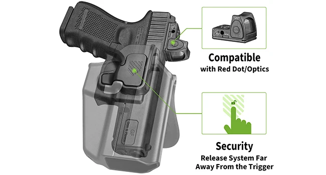 Sistema de retención de nivel II: Retención de nivel II con sistema de liberación del dedo índice, significa que su arma permanecerá en la funda sin ninguna posibilidad de caerse a menos que presione el botón de liberación para realizar su sorteo suave.Perfecto para aplicación de la ley y uso personal.