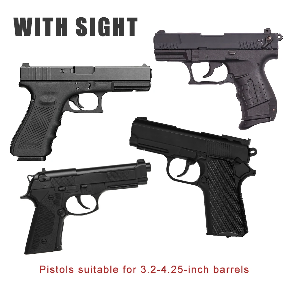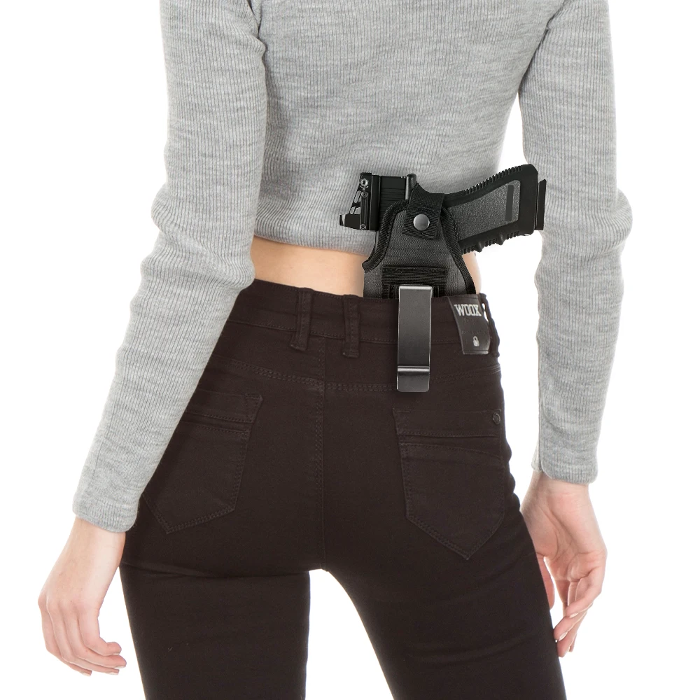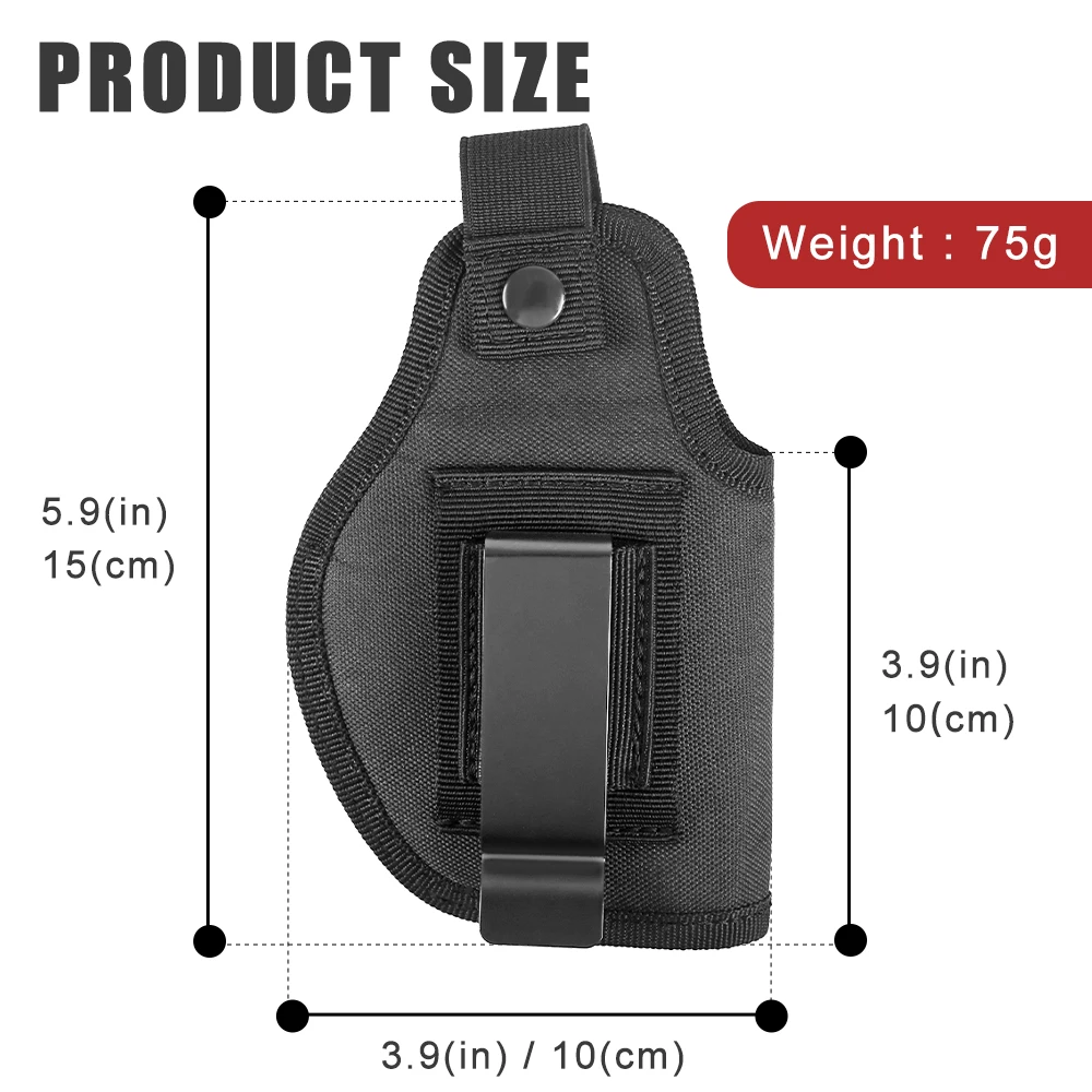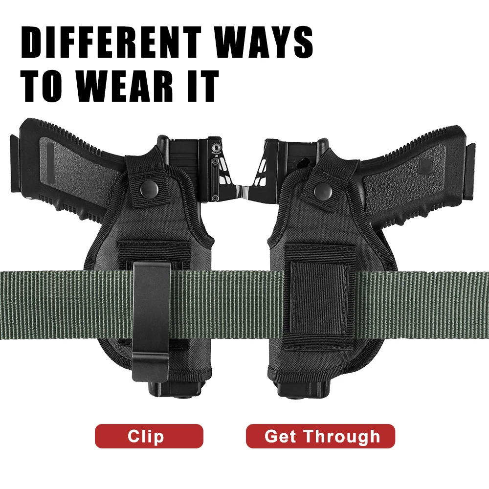 El clip para cinturón garantiza que la funda permanezca quieta cuando dibujas tu arma sin importar la situación.La funda para pistola se puede colocar en el exterior o dentro de la cintura para usar para dibujar con la mano izquierda o derecha.La funda para pistola está hecha para mano derecha e izquierda.Hay un lugar para el clip a cada lado.Puedes usarlo según los hábitos personales.Tenga en cuenta que las pistolas con accesorios para láser o linterna no encajarán.