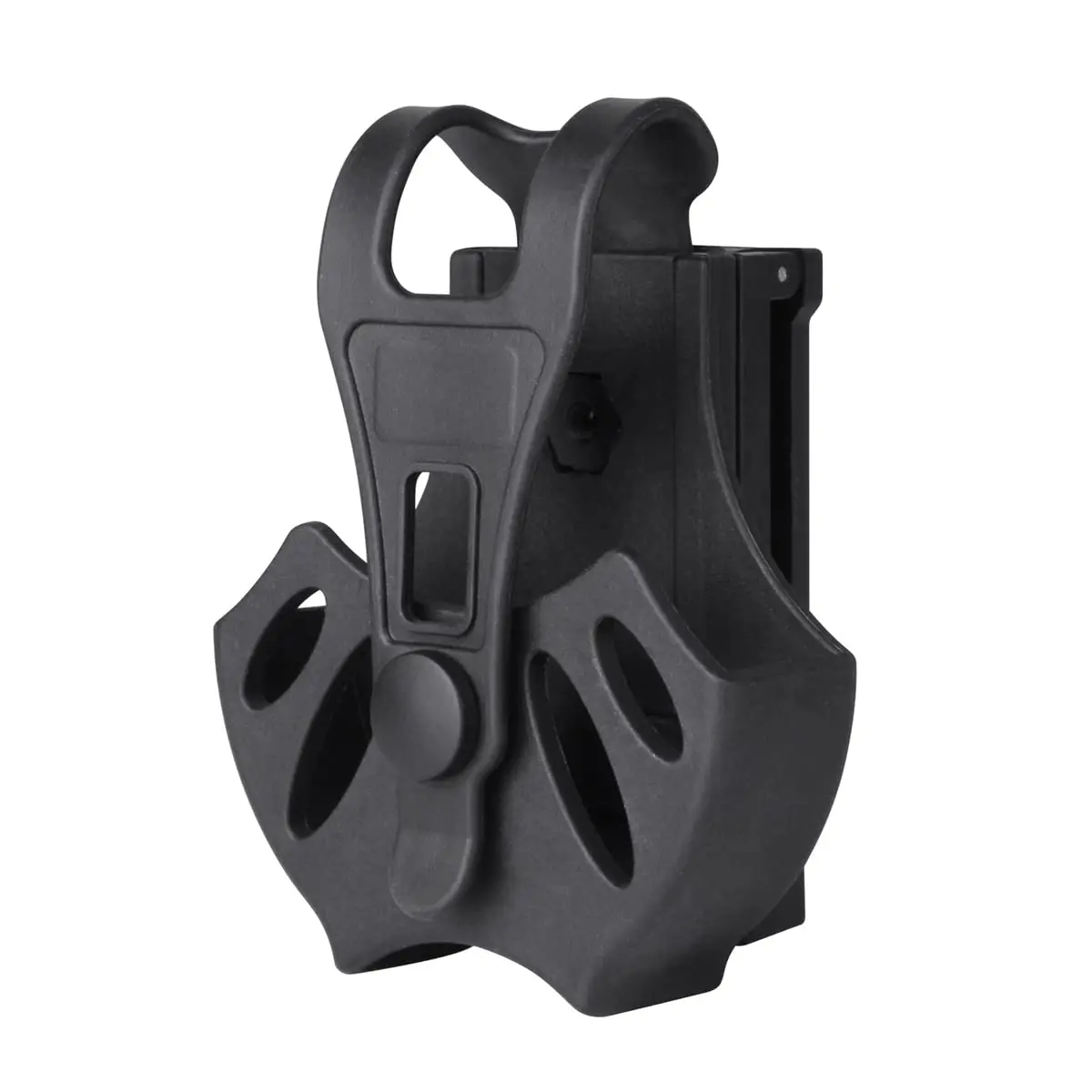 La bolsa universal para esposas para la mayoría de los puños con cadena o bisagras incluye puños ASP Fabricado con polímero ligero y resistente a impactos con cierre de goma suave Flexible y botón de metal a presión. Fácilmente accesible y extremadamente seguro Clip de cinturón giratorio de 360 grados compatible con cinturón de trabajo y sistema Molle Se adapta tanto a los puños encadenados como a los puños con bisagras, incluidos los puños ASP Diseño ligero y ergonómico, colocado dentro de las esposas para minimizar el área de la superficie Tamaño compacto: 4,1 pulgadas (L)* 3,2 pulgadas (W)* 1,1 pulgadas (D)cm El clip de cinturón se adapta a cinturones de trabajo de 2 " (50mm) y 2,25" (55mm) de ancho, diseñado con y para la aplicación de la ley El paquete incluye: 1 funda para puños