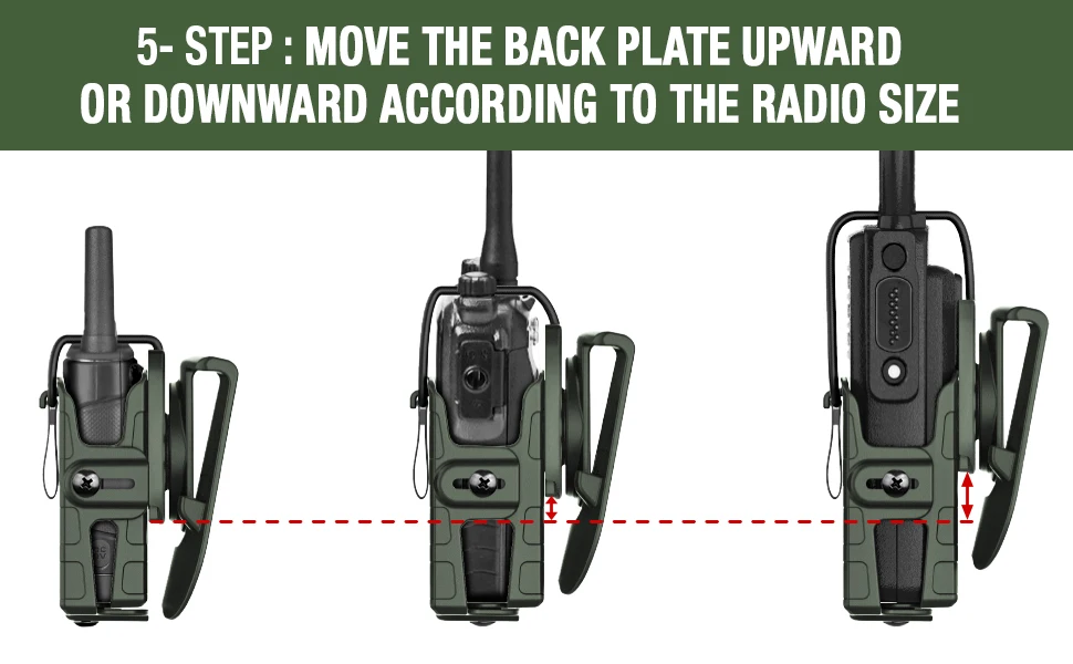 【Diseño ajustable】Ajuste los tornillos de la funda del walkie talkie para que se ajuste perfectamente a diferentes tipos de walkie-talkie.Diseñado para adaptarse a radios con dimensiones: Ancho: hasta 62 mm| Espesor: 24,5-47 mm| Altura: 90-170 mm