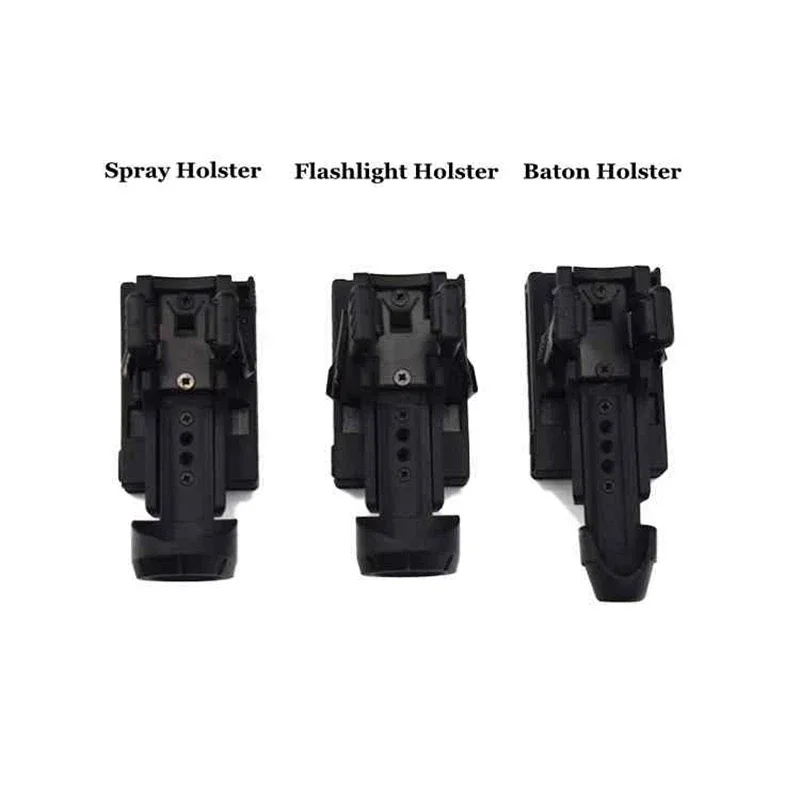 Feature:Type: Baton Holster/Flashlight Pouch/Spray HolderColor:BlackPolymer holster with 360 degree rotating belt clip.Fits Baton /Flashlight /Pepper Spray canisters with the dimensions of 1.4 to 1.6 inches in diameter.5 positions to adjust for different lengths of OC canisters.Adjustable belt clip for belt width from 3.2cm/1.26in to 6.5cm/2.56in.Belt clip works for both duty belt and MOLLE system for tactical vest, backpack etc.360 degree rotating belt clip.Different from the ones you can see in the market, This holster is produced of durable polymer material. It’s a better gear that can be widely used in policing, riot control, crowd control, and self-defense.