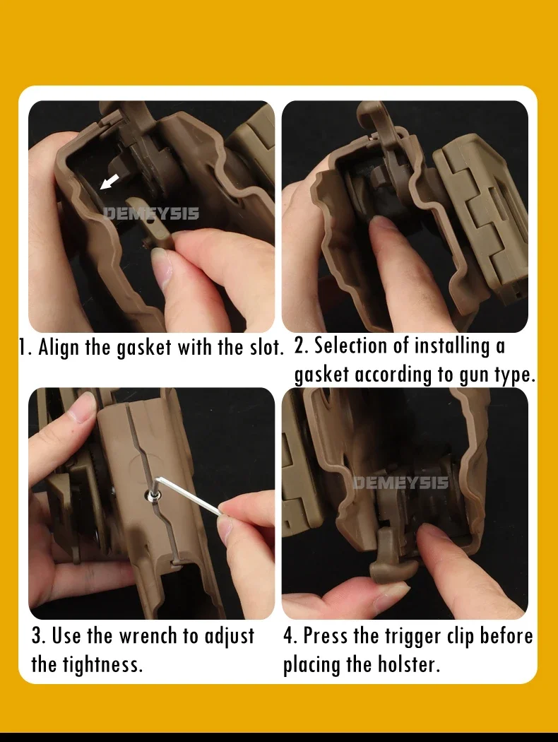 ●Retención ajustable:Ajuste el espacio adecuado para que se ajuste a su arma mediantelacercar o apretar tornillos con la llave.Configura la tensión a tu comodidad personal para garantizar un sorteo rápido y suave en todo momento.