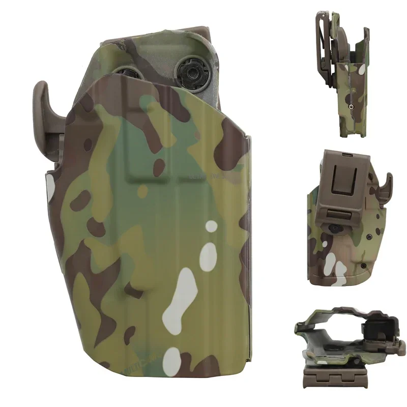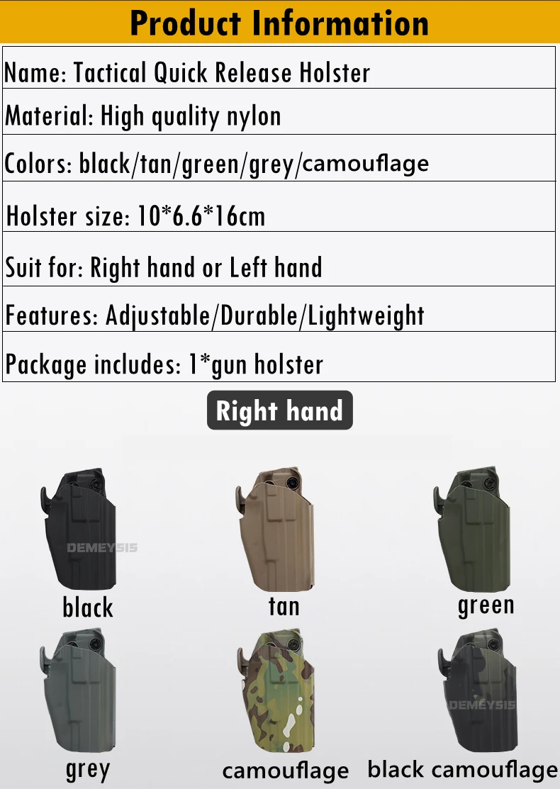 ●Botón de liberación rápida:Le permite sacar desde esta funda ajustable.Además, el mecanismo de bloqueo automático bloqueará y sujetará automáticamente su arma de fuego de forma segura
