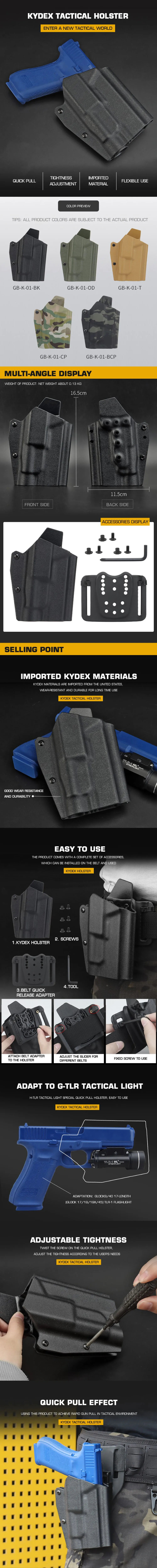 La funda de pistola está hecha de material KYDEX importado de los Estados Unidos, que tiene las características de ligereza, resistencia al desgaste y resistencia a altas temperaturas. ¡Es muy popular entre los fanáticos militares internacionales y los entusiastas del aire libre!