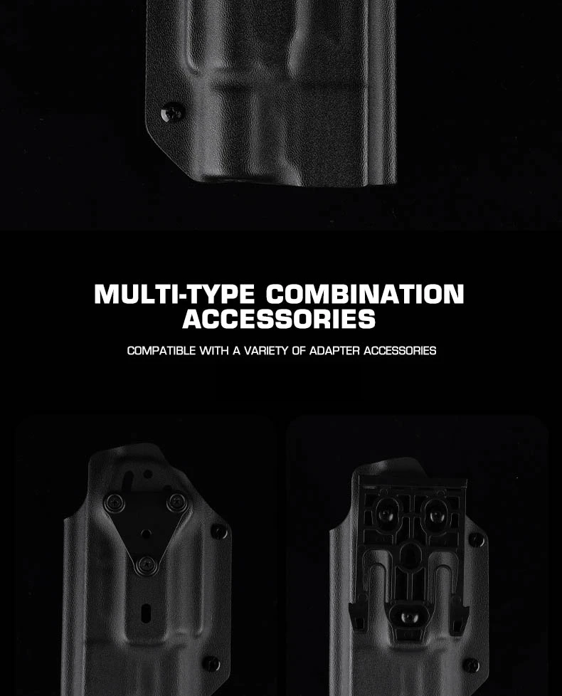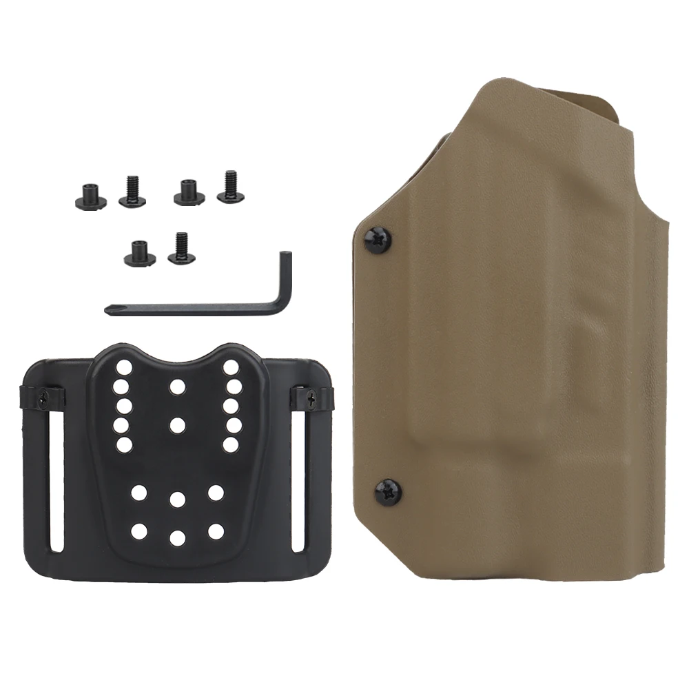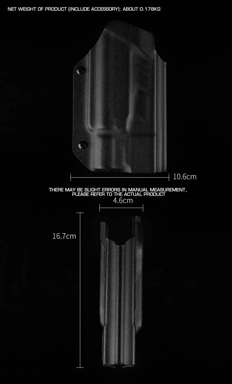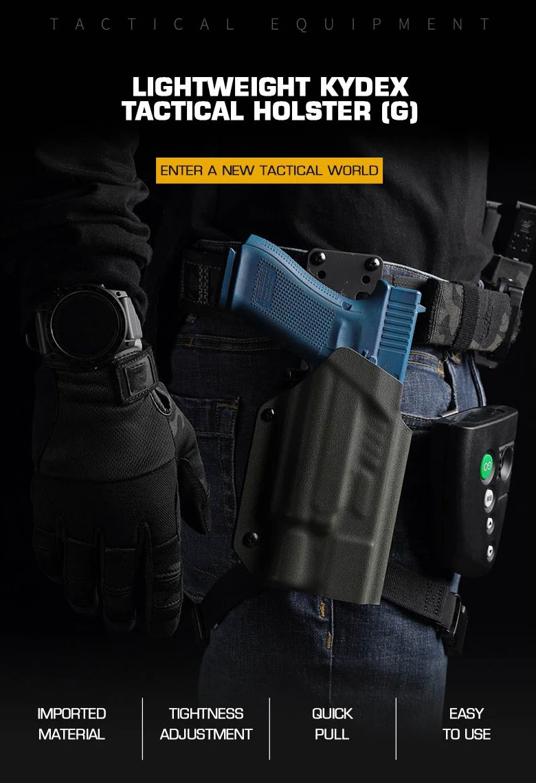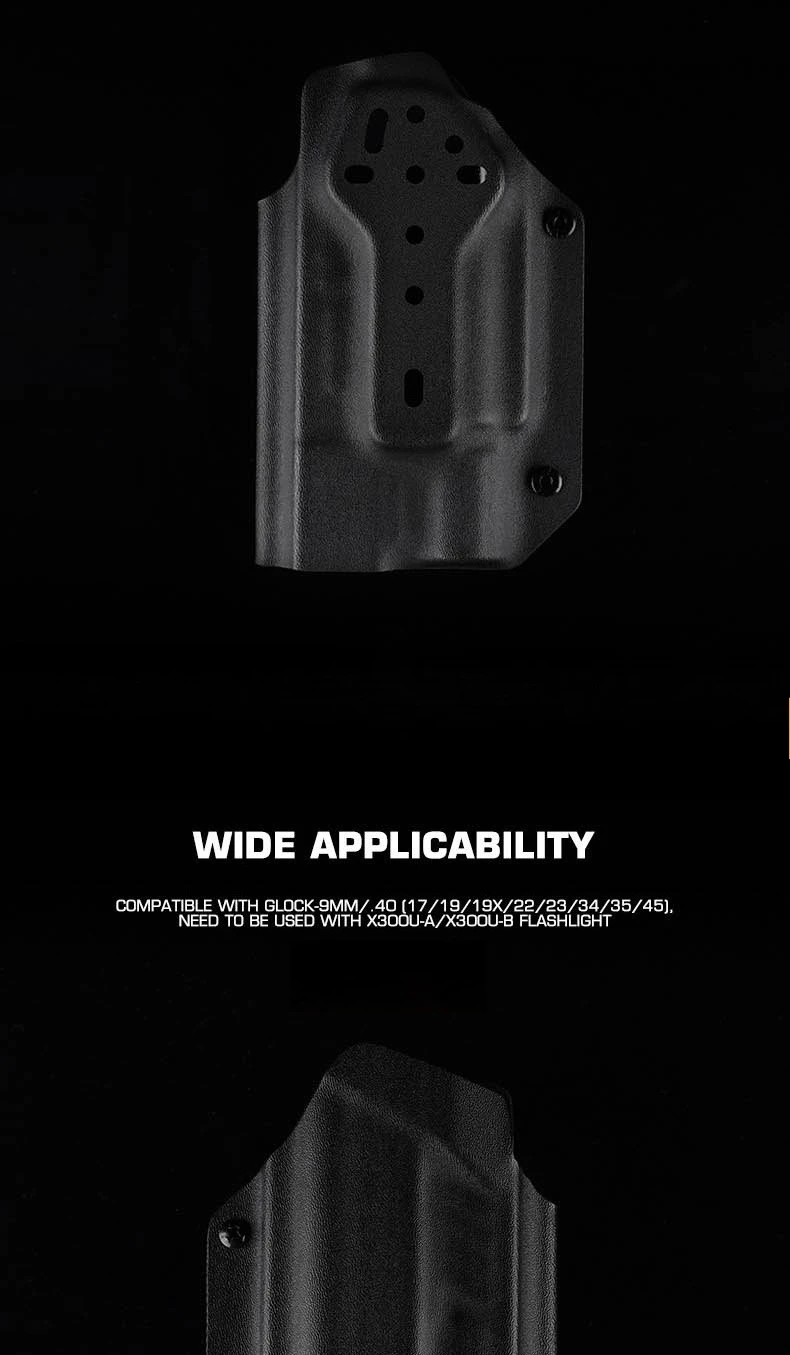 PRODUCT NAME: LIGHTWEIGHT KYDEX TACTICAL HOLSTER (G) ITEM NO.:GB-K-18 APPLICABLE SCENE:TACTICAL EQUIPMENT,MOVIE PROPS PRODUCT MATERIAL:U.S.KYDEX PRODUCT ADAPTATION:GLOCK9MM/.4O[17/19/19X/22/23/34/35/45]. NEED TO BE USED WITH X3OOU-A/X3OOU-B FLASHLIGHT COLOR:BLACK,GREEN,TAN SIZE:30X18X6CM WEIGHT:200G PACKAGE: 1x Holster or 1 x Holster with QLS kits (When you make a order of it, please choose the correct options)