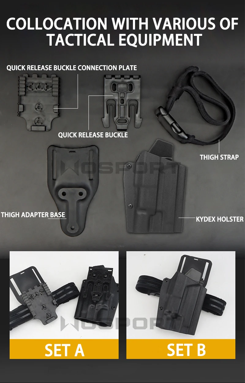 2. Juego A: funda * 1, correa para el muslo * 1, lazo para el cinturón * 1, hebilla de liberación rápida * 1