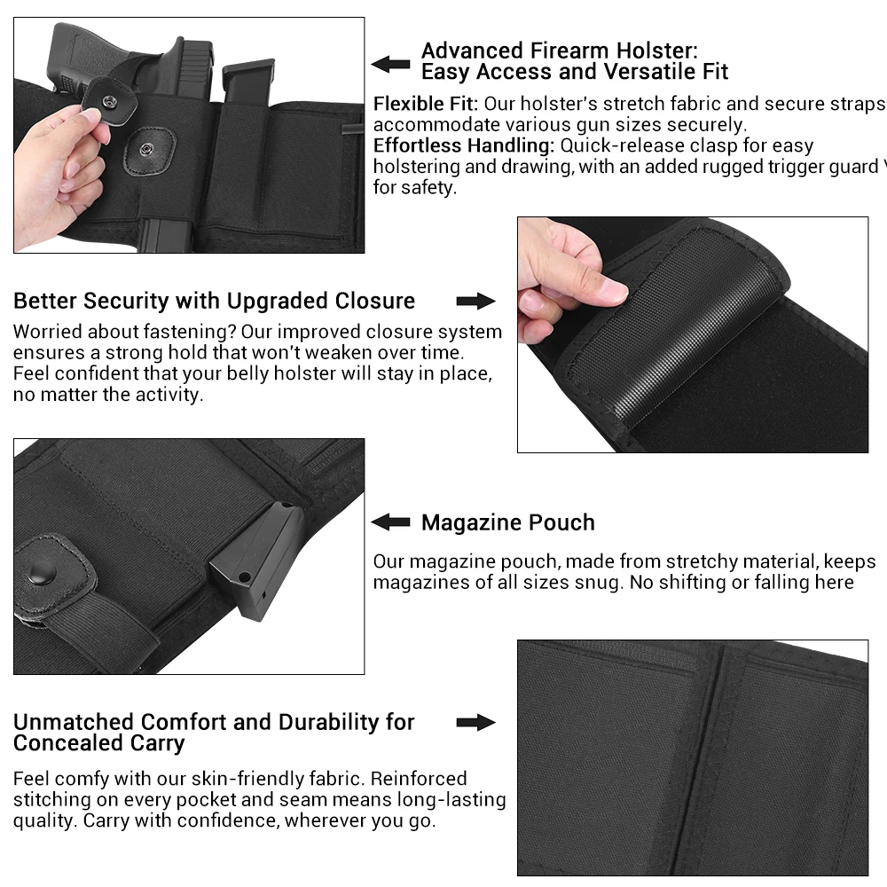 - Nuestra funda para pistola con banda para el vientre, meticulosamente diseñada tanto para hombres como para mujeres, armoniza la comodidad y la seguridad.