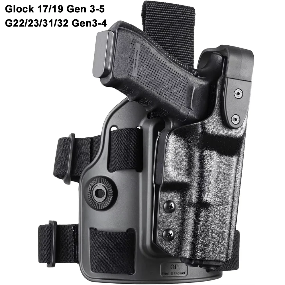Gun & Flower Level II Glock17 Duty Drop Leg Holster para Glock 17 Gen 3-5 Glock 22/31 Gen 3-4, Glock 19X/44/45, Funda con plataforma Kydex Drop Leg, Funda para aplicación de la ley, Mano derecha