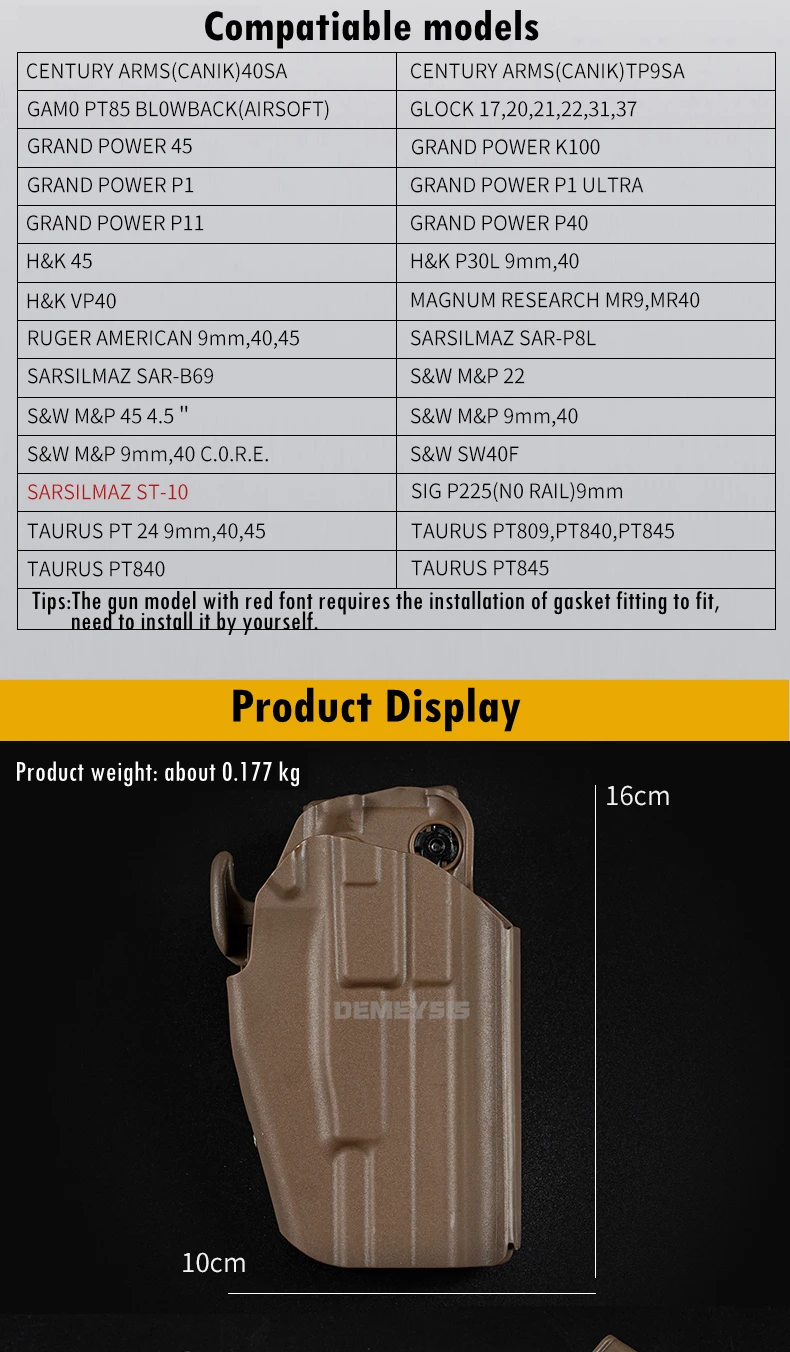 ●Funda multiajuste: esta funda se adapta a más de 30 pistolas, para GLOCK 17, 20, 21, 22, 31, 37.GRAN POTENCIA 45, P1, P11, P40.H&K 45.H&K VP40.S&W M&P 22.S&W SW40F.SIG P225 (SIN RAIL)9mm.TAURUS PT809, PT840, PT845.Y para más modelos de armas, consulte la tabla de descripción del producto.