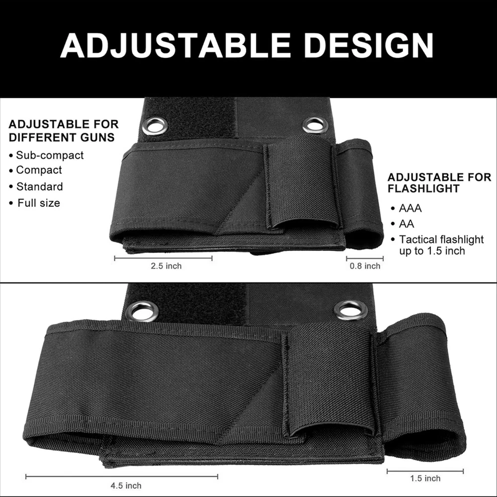 Cuenta con una solapa de velcro infinitamente ajustable, lo que facilita el ajuste de varios tamaños de armas de fuego, incluidos modelos compactos, subcompactos y de tamaño completo.