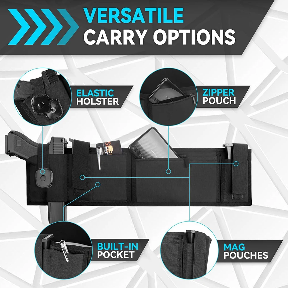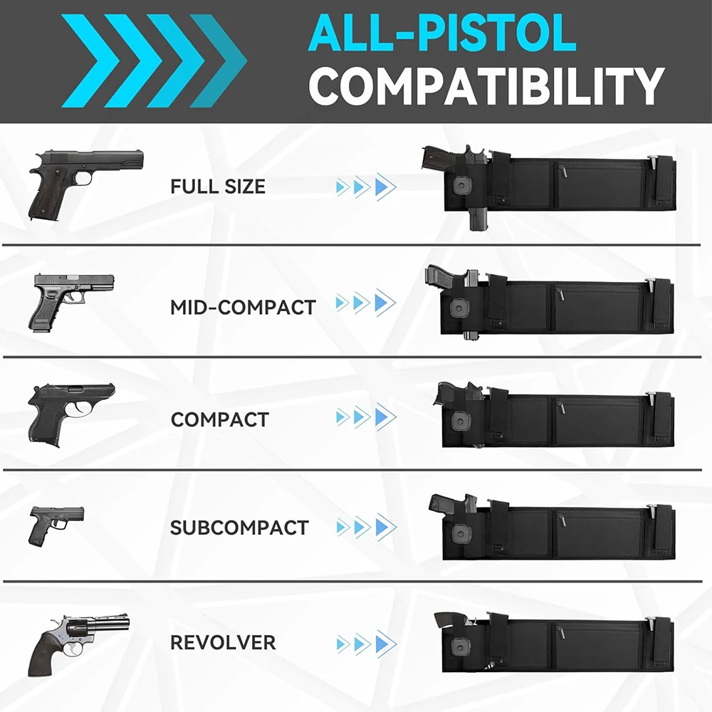 - La banda para el vientre oculta está diseñada para adaptarse a cualquier pistola y revólver pequeño, compacto, mediano y de tamaño completo.