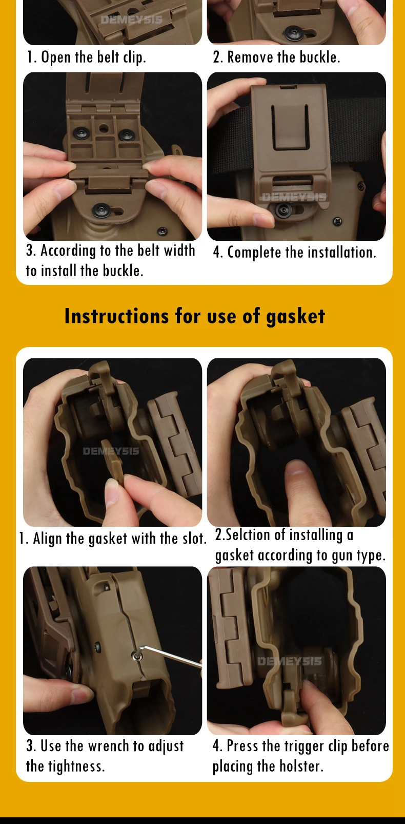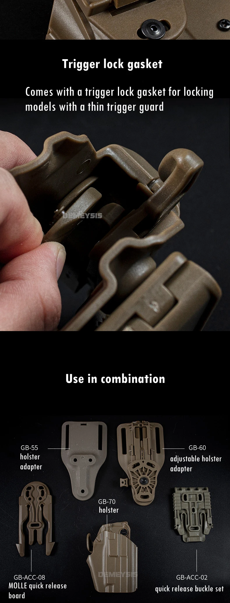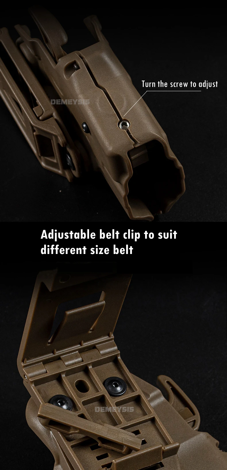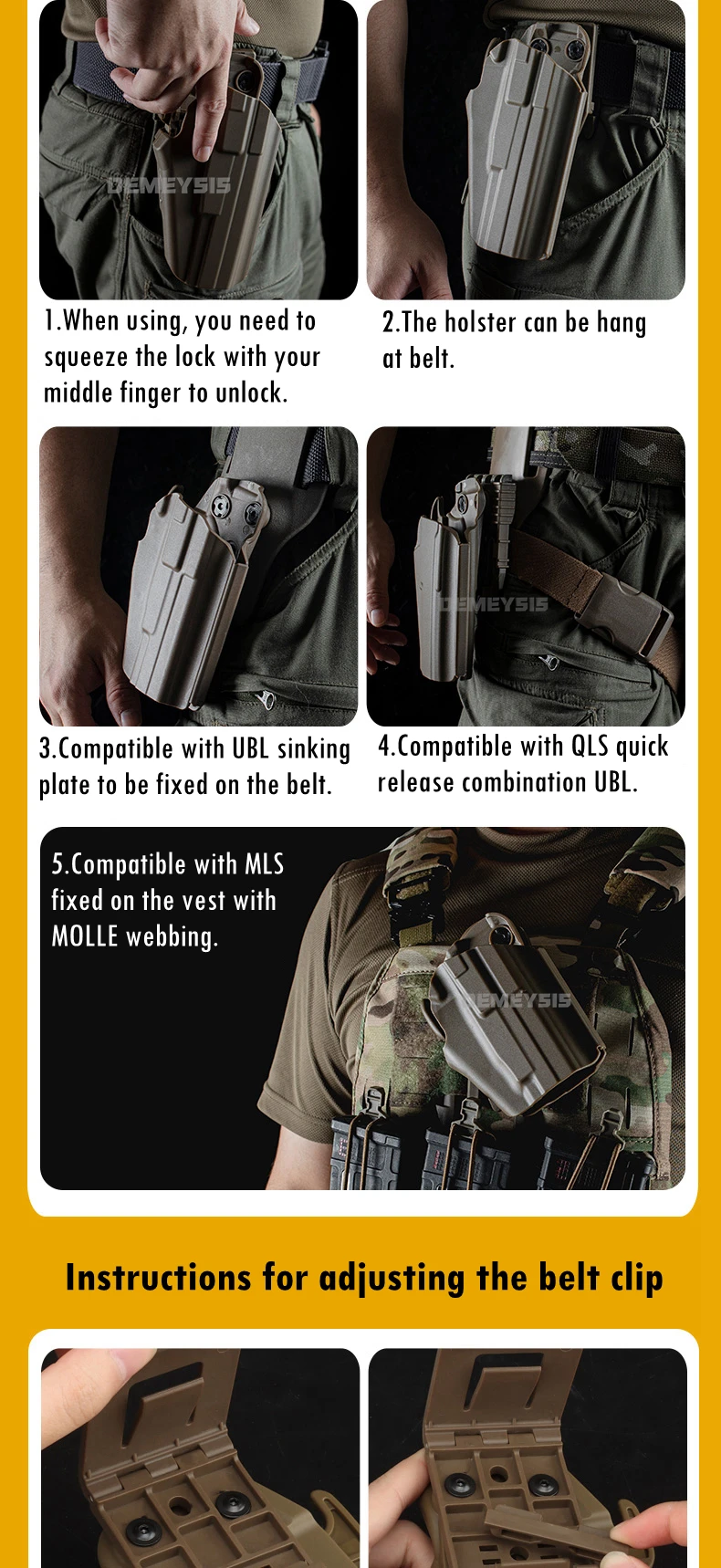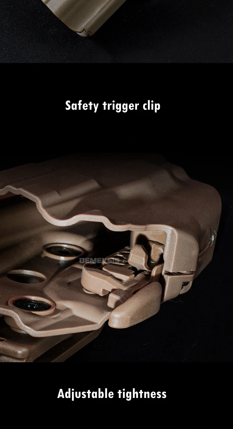 ● Botón de liberación rápida: esta funda táctica requiere que coloque el dedo medio en la posición del gatillo para liberar su arma cuando la esté usando, extraiga rápidamente de esta funda ajustable.