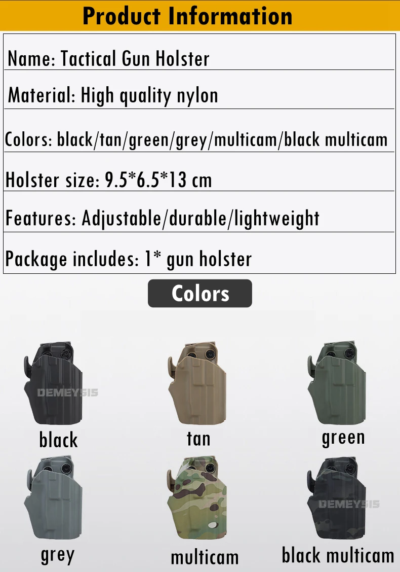 ● Durabilidad: esta funda para pistola está hecha de material duradero y ligero que es resistente a los impactos, el calor y los arañazos, ofreciendo un acceso rápido y fiable. Está diseñado para entrenamiento táctico, caza, deportes, etc.
