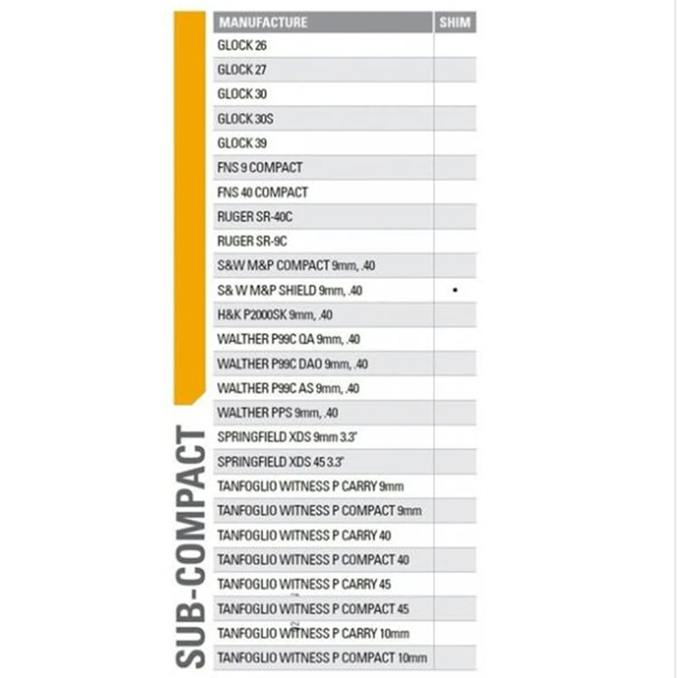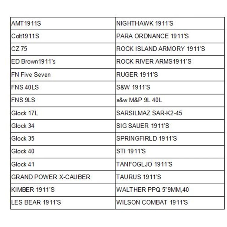 Combat 1911, Walther Ppq M2 9/40 (5In Bbl), Walther Ppq 9/40 (5In Bbl), Taurus 1911, Tanfoglio 1911 S & W M & P 9L/40L, S & W 9L/40L Core, S & W 1911, Ruger 1911, Rock River Arms 1911, Rock Island 1911, Remington 1911, Para 1911, Les Baer 1911, Kimber 1911, Grand Power X-Caliber, Glock 17L, 34, 35, 41, Fnh Fns 9/40 Ls, Fn Five-Seven, ed Brown 1911, CZ 75, Colt 1911S, Beretta M9, Beretta 96, 96A1, Beretta 92F 92Fs, Beretta 92A1, 92A3, Beretta 92, 92S, Beretta 92 Centurion, 92 Vertx, Beretta 90-Two, Ati 1911.