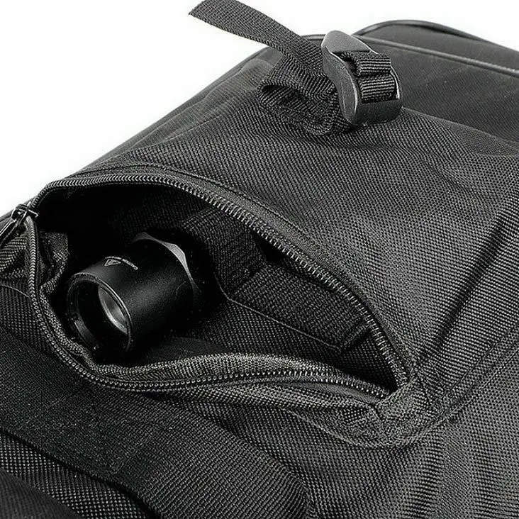 La cubierta extendida incorporada del compartimento principal más grande se utiliza para almacenar rifles, el compartimento exterior es capaz de almacenar pistolas o pistolas.
