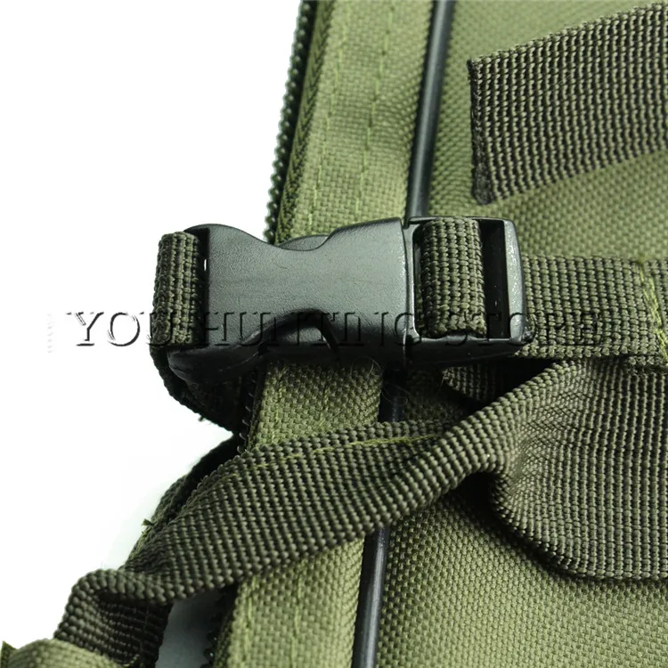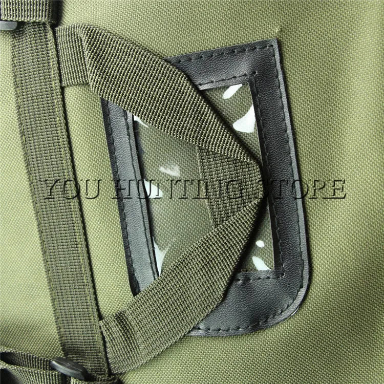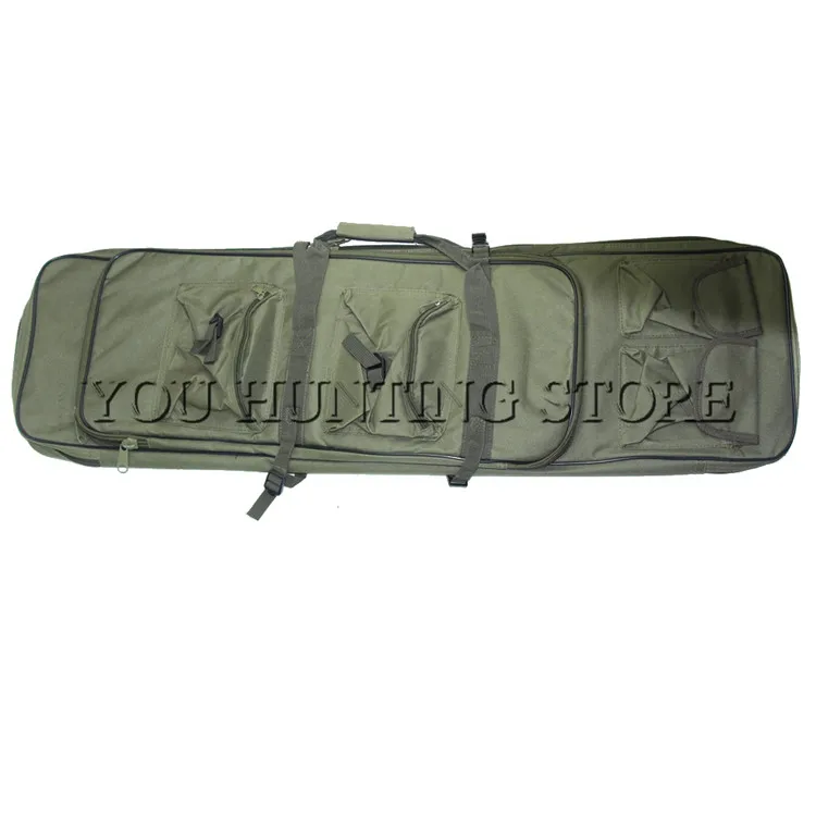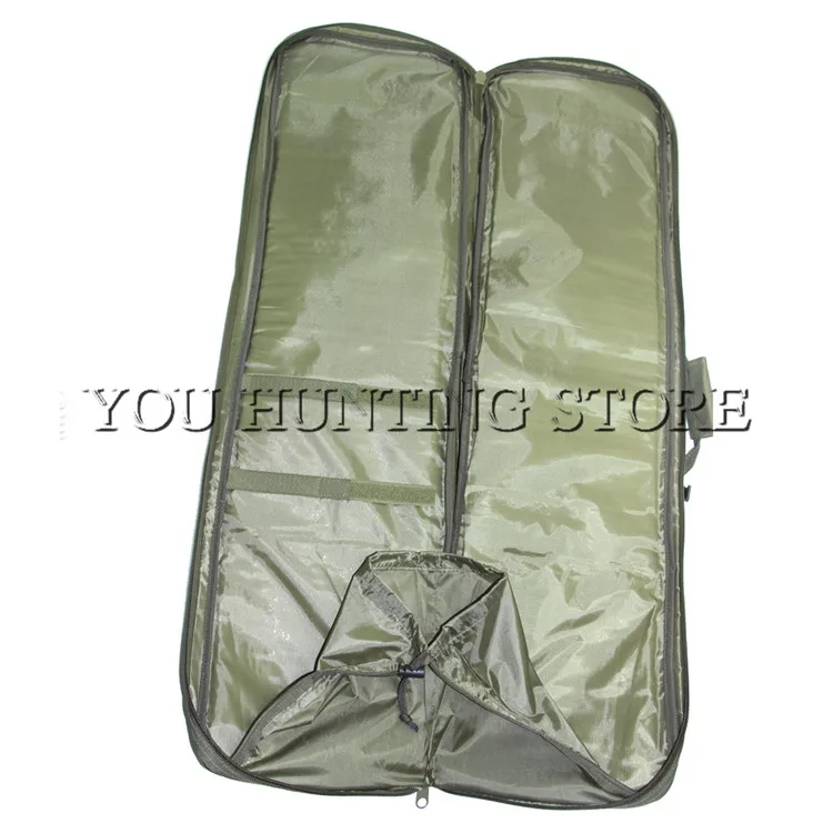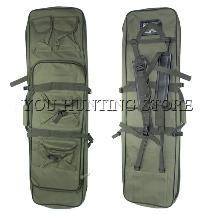 1. Hecho con material de nailon de alta densidad. 2. Contiene una cubierta extendida capaz de almacenar el rifle con una longitud máxima de 95 cm. 3. Bolsa de pistola más pequeña capaz de sostener un rifle de 95 cm de largo. 4. 2 cremalleras y 2 bolsas pequeñas con tapa v-lcro para llevar revistas o engranajes pequeños. 1 gran compartimento con cremallera en la parte trasera. 5. Soporte de foto/Tarjeta De Nombre en la parte posterior. 6. Con 2 correas para llevar a mano. 7. Correa de hombro acolchada ajustable y correa de pecho. 8. Con acolchado grueso para protección. 9. Perfecto para actividades de guerra al aire libre.