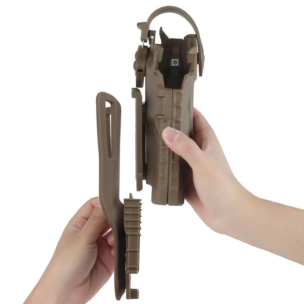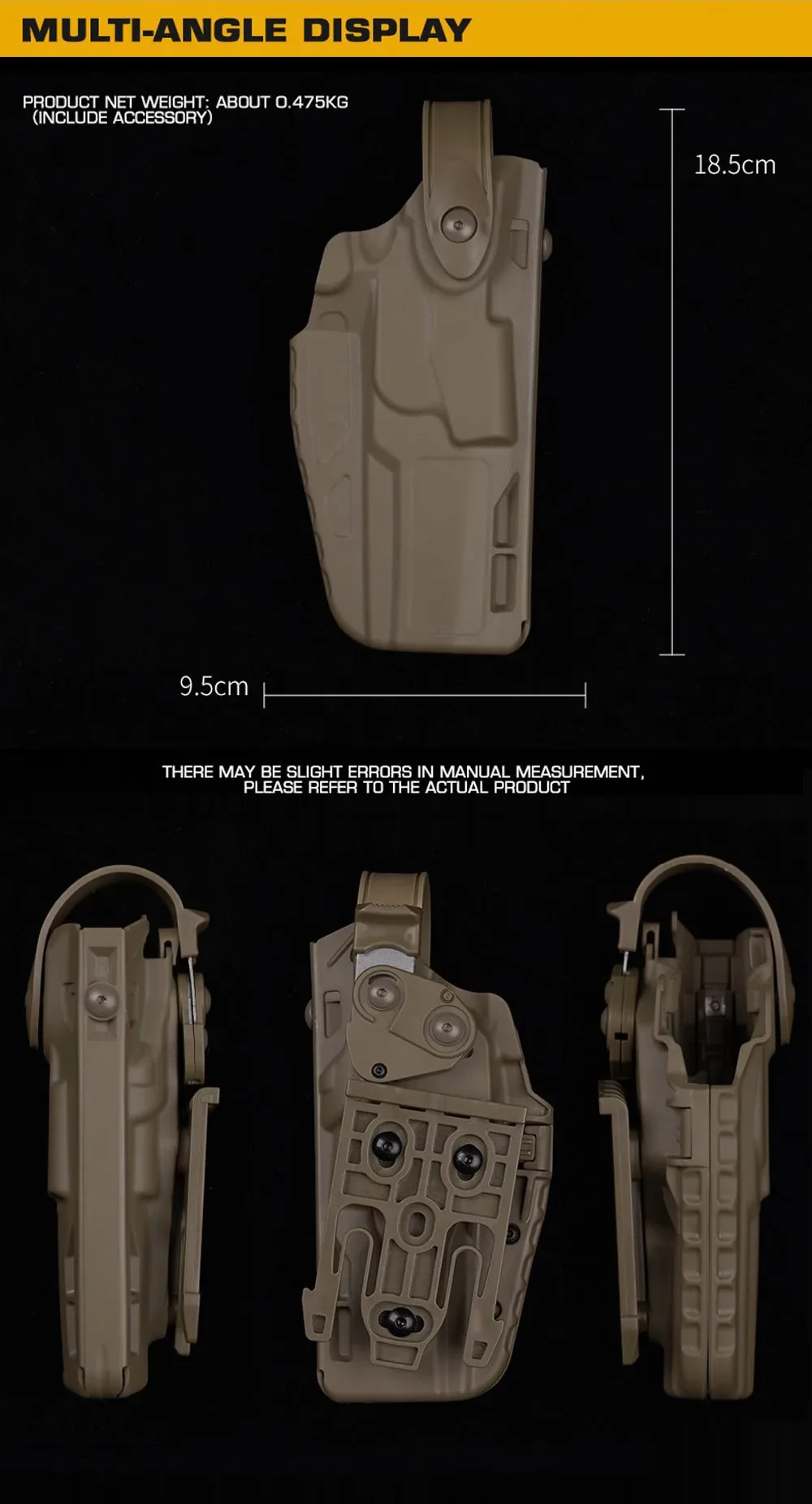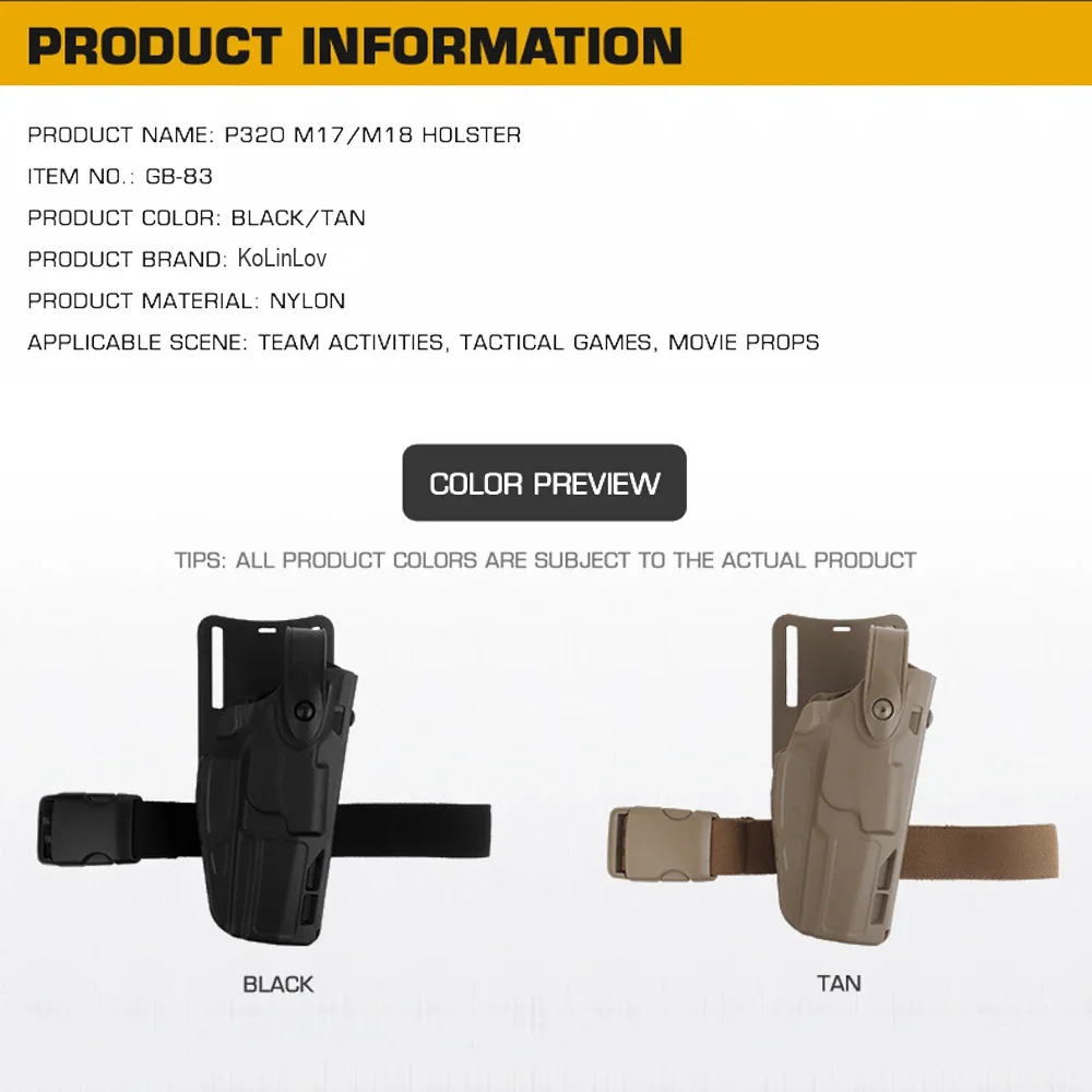 Nombre del producto: funda P320 M17/M18. Número de artículo.:GB-83 Tamaño del producto: 22,5*11,5*11 cm Peso bruto del producto: 0,558 KG Color del producto: negro/tan Material principal: nailon Escena aplicable: caza, deportes al aire libre y otros deportes tácticos de airsoft, etc.