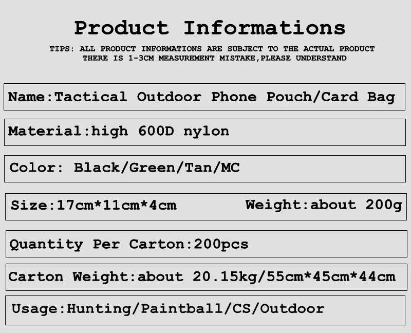 Material: nailon 600dTamaño: 17 cm * 11 cm * 4 cmDiseño para sostener teléfonos móviles de más de 7 pulgadas, se puede usar en el cinturón y sujetar al chaleco, mochila, plataforma MOLLE, etc.Excepto para guardar teléfonos móviles, también puede contener billetera y otras pequeñas cosas.Dentro del ponch hay flocado, puede absorber los golpes y proteger perfectamente las cosas del interior.Hay ganchos y bucles, que pueden sujetar cosas pequeñas y livianas;Puedes llevarlo como bolso de mano o conectarlo a tu equipo de combate;Ideal para deportes de caza al aire libre y otras actividades deportivas.Lista de paquetes: 1 Uds x bolsa