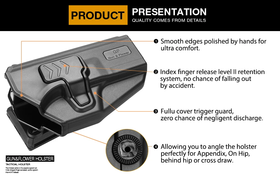 ★【Sistema de bloqueo automático】: el sistema de retención de nivel II significa que no liberará el arma hasta que presione el botón de liberación hacia abajo mientras dibuja para aumentar la seguridad personal.Eso significa que nuestra funda puede soportar el entorno operativo más duro y es un equipo perfecto para militares, entrenadores de tiro y agentes de la ley, especialmente protección personal.