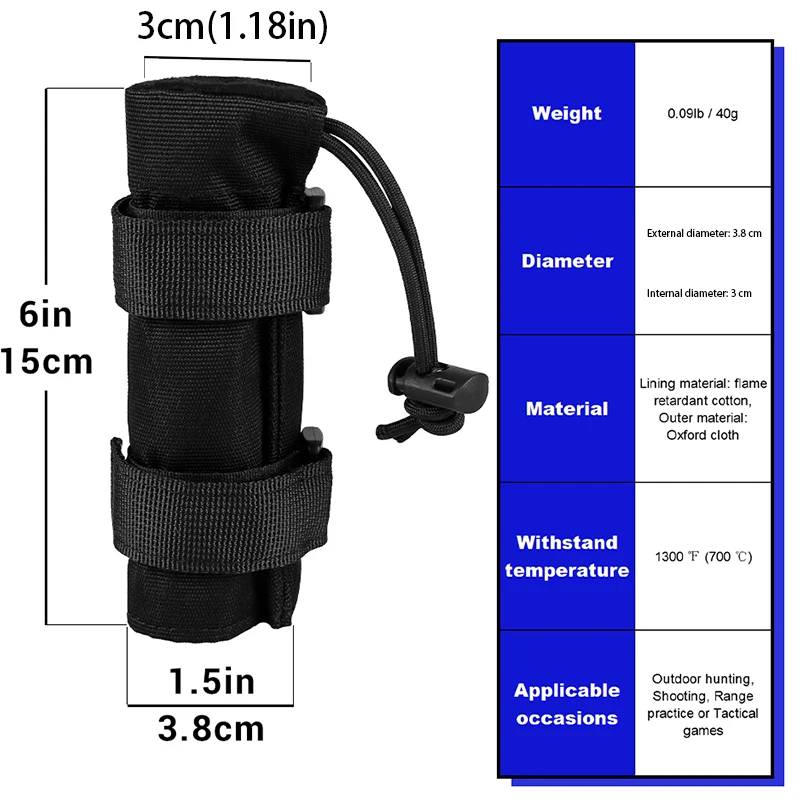 -Our silencer flame-retardant insulation cover is very suitable for outdoor hunting, shooting, shooting range practice or tactical games. It can not only effectively prevent heat injuries, but also protect other tactical equipment from being melted by high temperatures. Whether it is an airgun or a rifle, this silencer cover can provide you with all-round protection, ensuring that your scope cover, the rattail line of the tactical flashlight, and the cloth you wear are not affected by high temperatures. Whether in the field or on the training ground, this silencer cover is your indispensable safety companion.