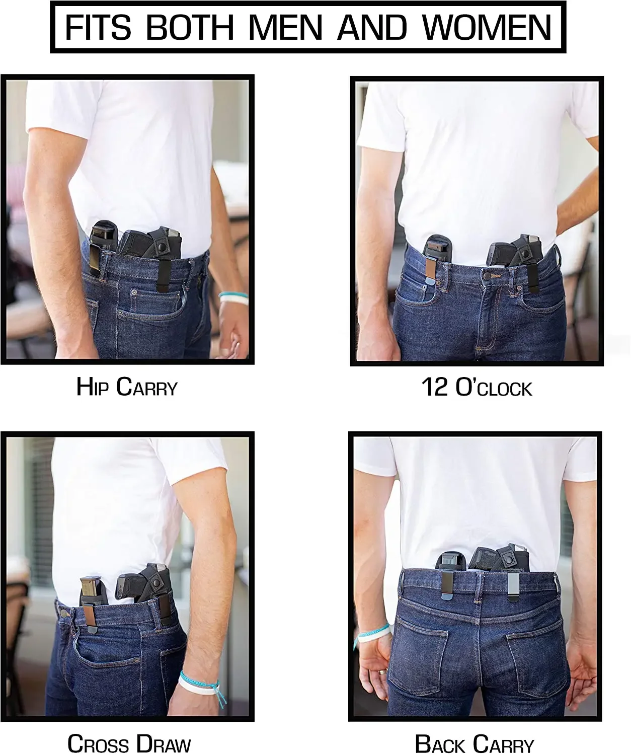 MUCHAS OPCIONES DE TRANSPORTE: uso dentro de la cintura, tracción cruzada, transporte de cadera, posición de las 5 en punto (detrás de cadera), 12 en punto y transporte de espalda.Correa de seguridad sobre el arma de fuego.
