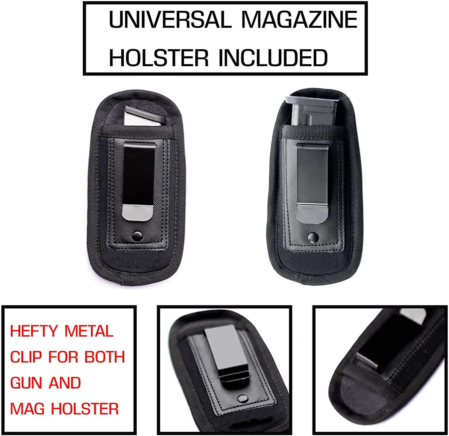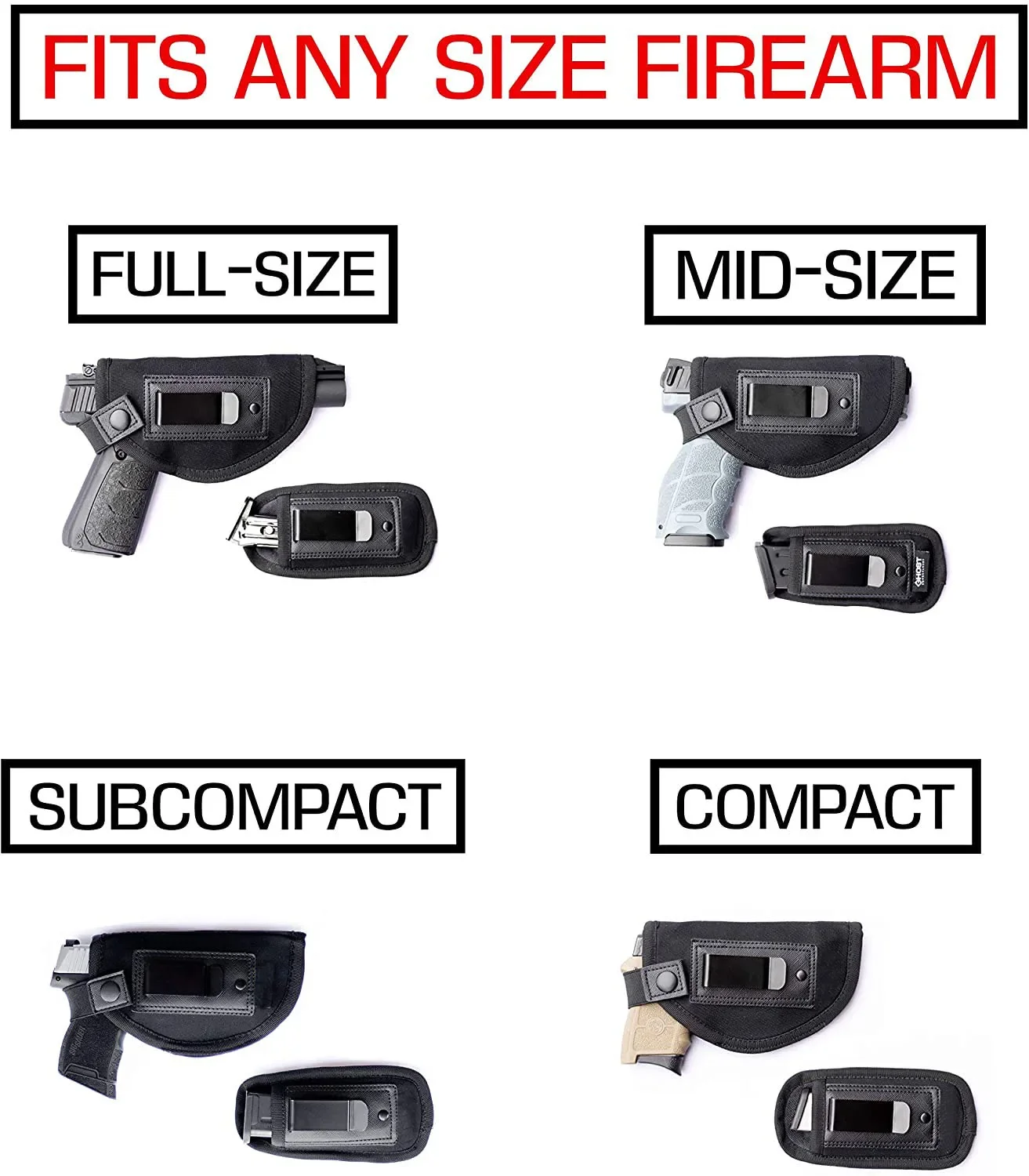 2.Esta funda universal para pistola fue diseñada para acomodar cualquier tamaño de arma de fuego, desde un subcompacto hasta un tamaño completo.Se adapta a todas las pistolas; Glock, Smith y Wesson, Ruger, Sig Sauer, Colt, Heckler & Koch, Beretta, Kimber, Walther, Taurus, FN, Mossberg, Stoeger, Browning.