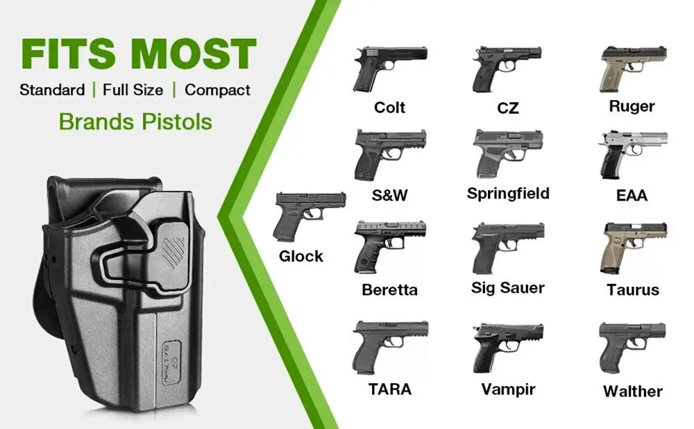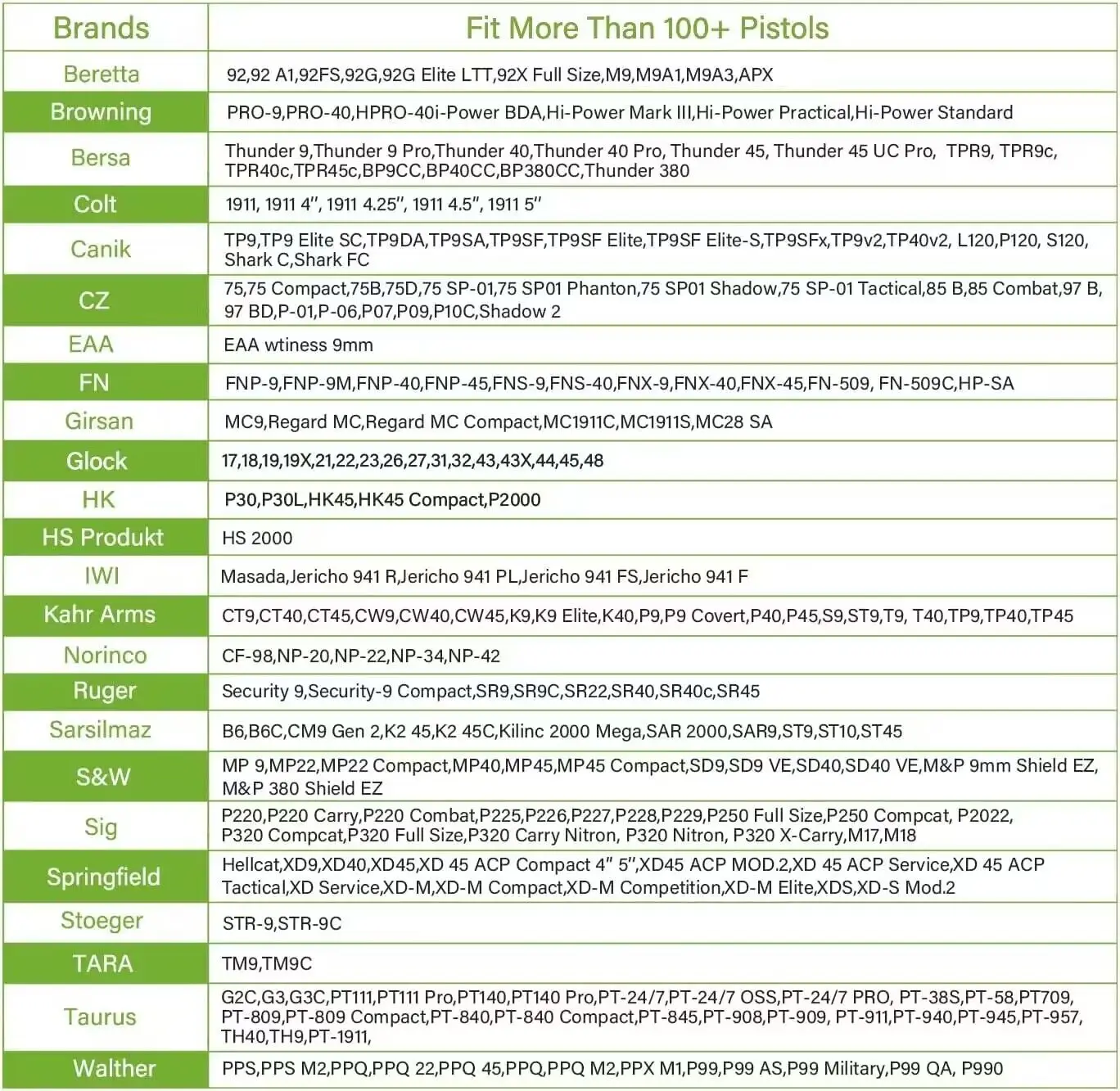 Más de 100 modelos para Beretta Colt1911 TP9 TNP MC9 GLOCK17 19 HP P30 HK45 RUGER SECURITY9 SW MP SIG P220 P226 SPRINGFIELD HELLCAT XD9 XD45 STR9 TAURUS G2C G3 PT24/7 PT809 PT845 PT908 909 PT938 940 945 PT92 TS9 TH40
