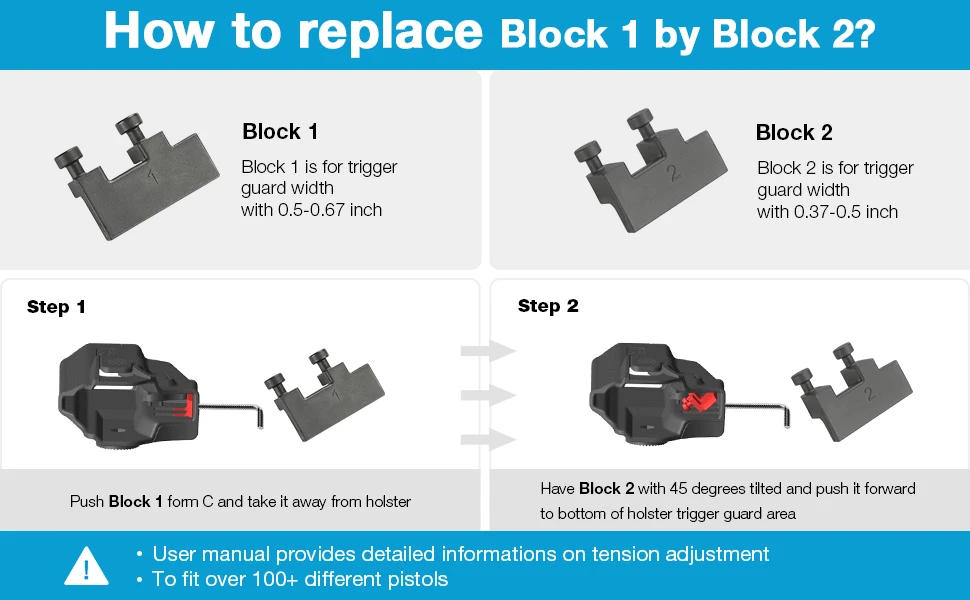 Se adapta a la mayoría de las marcas de tamaño estándar/tamaño completo/compacta: nuestra funda UNI PRO es adecuada para pistolas con un tamaño de protección de gatillo de 0,37-0,67 pulgadas.Y se adapta a todas las miras/ópticas de punto rojo.Fácil ajuste para adaptarse a más de 100 pistolas. Consulte el video y la imagen para ayudarlo a comprender mejor cómo ajustar esta funda para adaptarse a diferentes tamaños de pistolas.(La llave Allen pequeña está colocada Aleady dentro de la parte posterior de la funda)