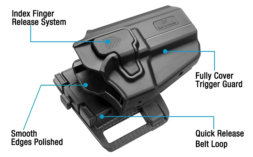 Versión mejorada del sistema de liberación del dedo índice: este sistema de liberación del dedo índice de la funda universal lejos del gatillo de la pistola, más seguro de la retención de nivel II.Le permite colocar su dedo índice (Activador) en la posición perfecta que permite un extracción suave y rápida de esta funda.