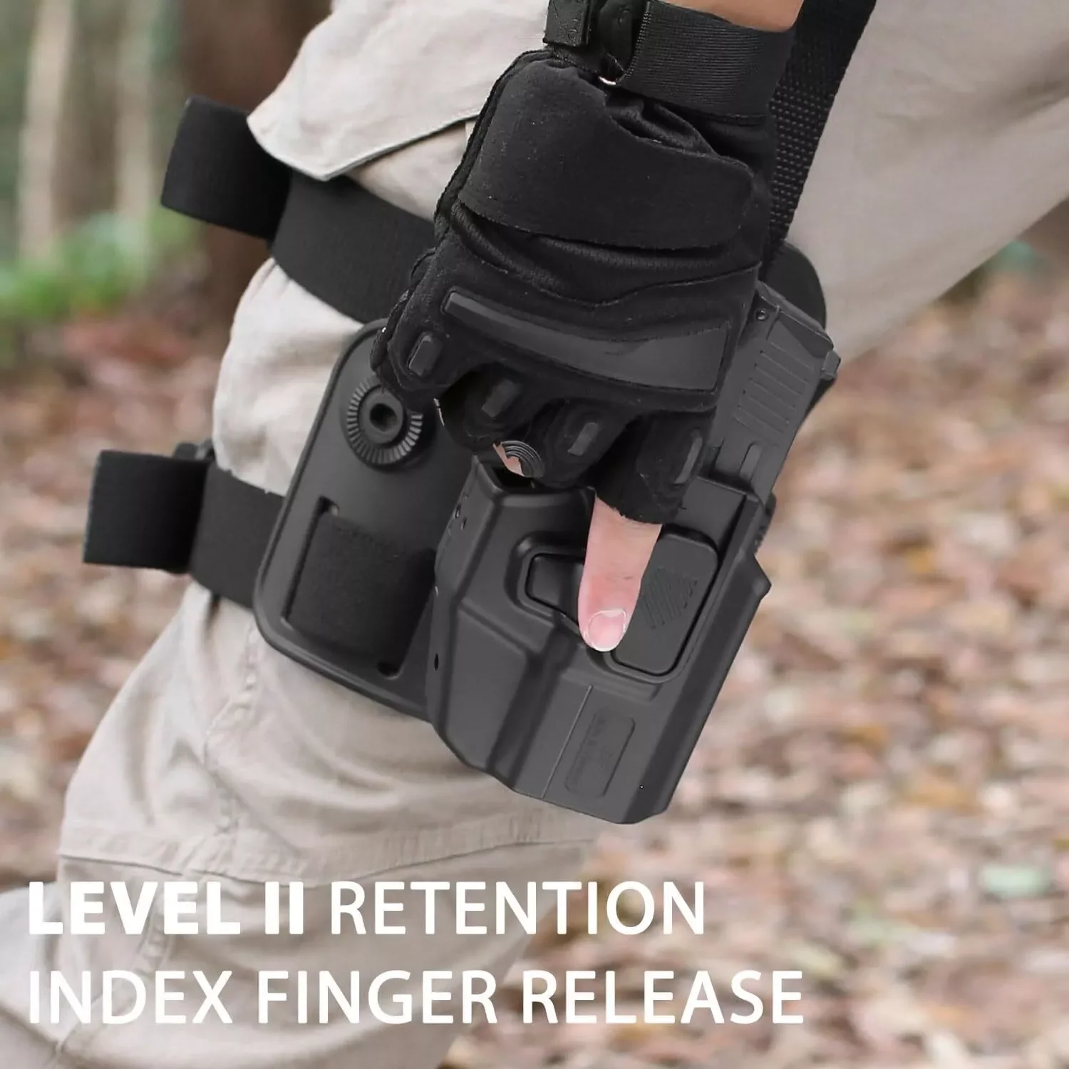 Retención de nivel II con liberación de índice: Equipado con un mecanismo de liberación de índice para una retención segura de armas de fuego y un acceso rápido y eficiente, lo que garantiza una seguridad óptima y un tiro rápido durante escenarios de transporte táctico y diario.