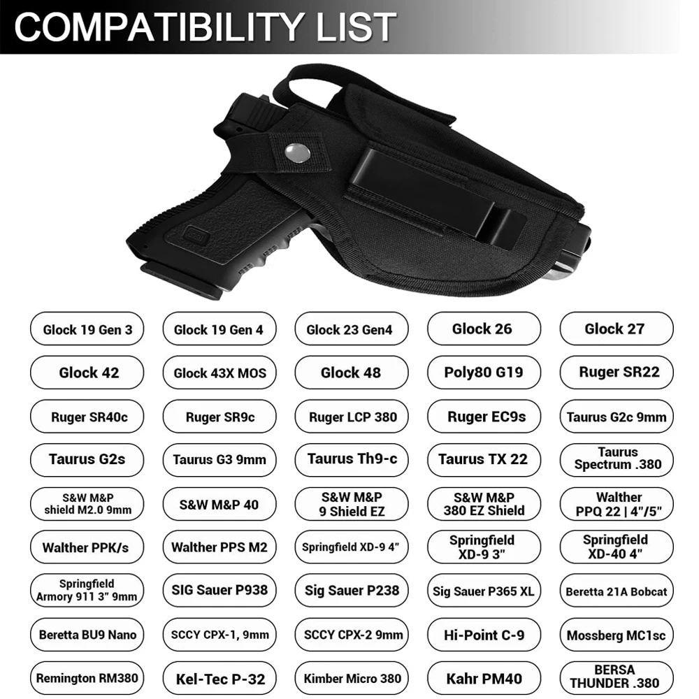 【Se adapta a la mayoría de tamaños】La funda universal para pistola encaja perfectamente en Glock 17, 19, 23, 32, 26, 27, 30, 39, 28, 42, 43, 36.También es compatible con 1911, Sig Sauer P226 y P238 y P365, S&W, M&P, Ruger, Beretta, Springfield, Taurus, Kimber, Walther y más pistolas de 9 mm, 380, 45ACP.Combinando con el hilo adaptable y dos longitudes diferentes de correas, la funda puede cortar el hilo para colocarlo en una variedad de pistolas, desde subcompactas hasta grandes y más.