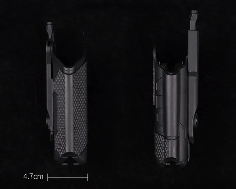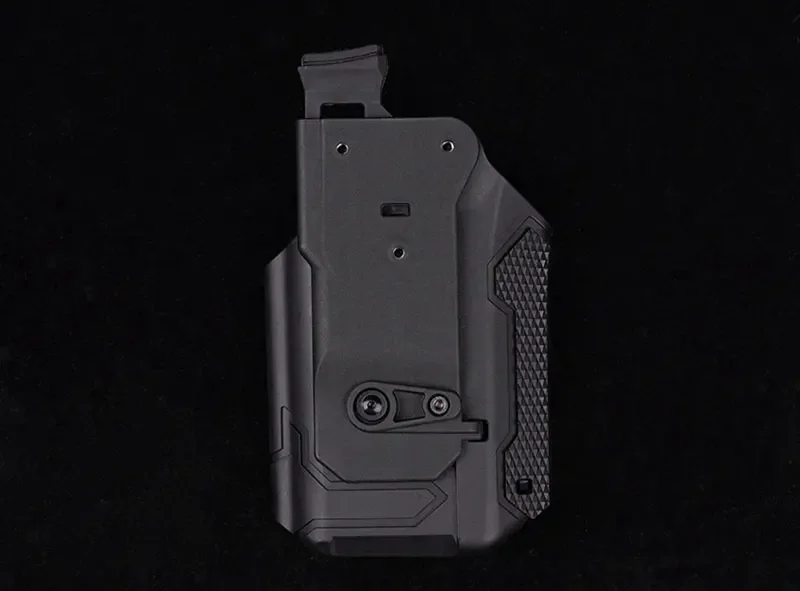 Una funda táctica universal que puede contener cualquier tipo de pistola semiautomática, incluso con una linterna o láser montado. Liberación con botón pulsador. Excelente factura. Precio inmejorable.