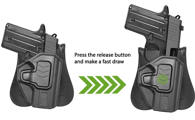 Level II Retention:Index finger-activated release system protects your gun from being taken away by others. It can only be drawed when the release buttom is activated.