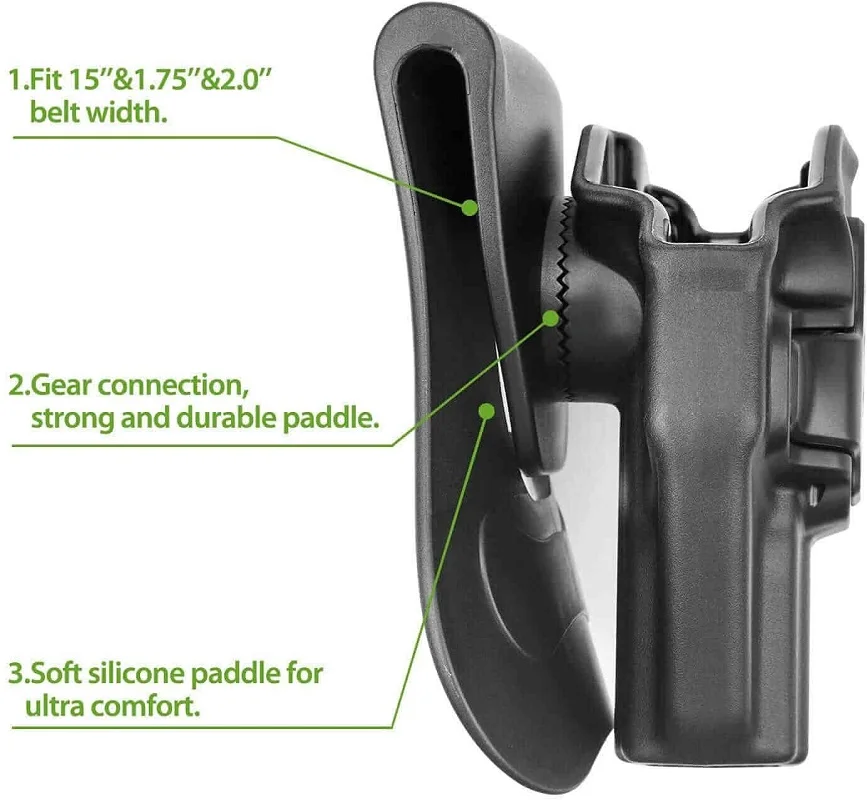 Audible Click System Locking Feedback:This holster provide locking feedback with a crisp clicking sound when weapon is securely sat in the holster.