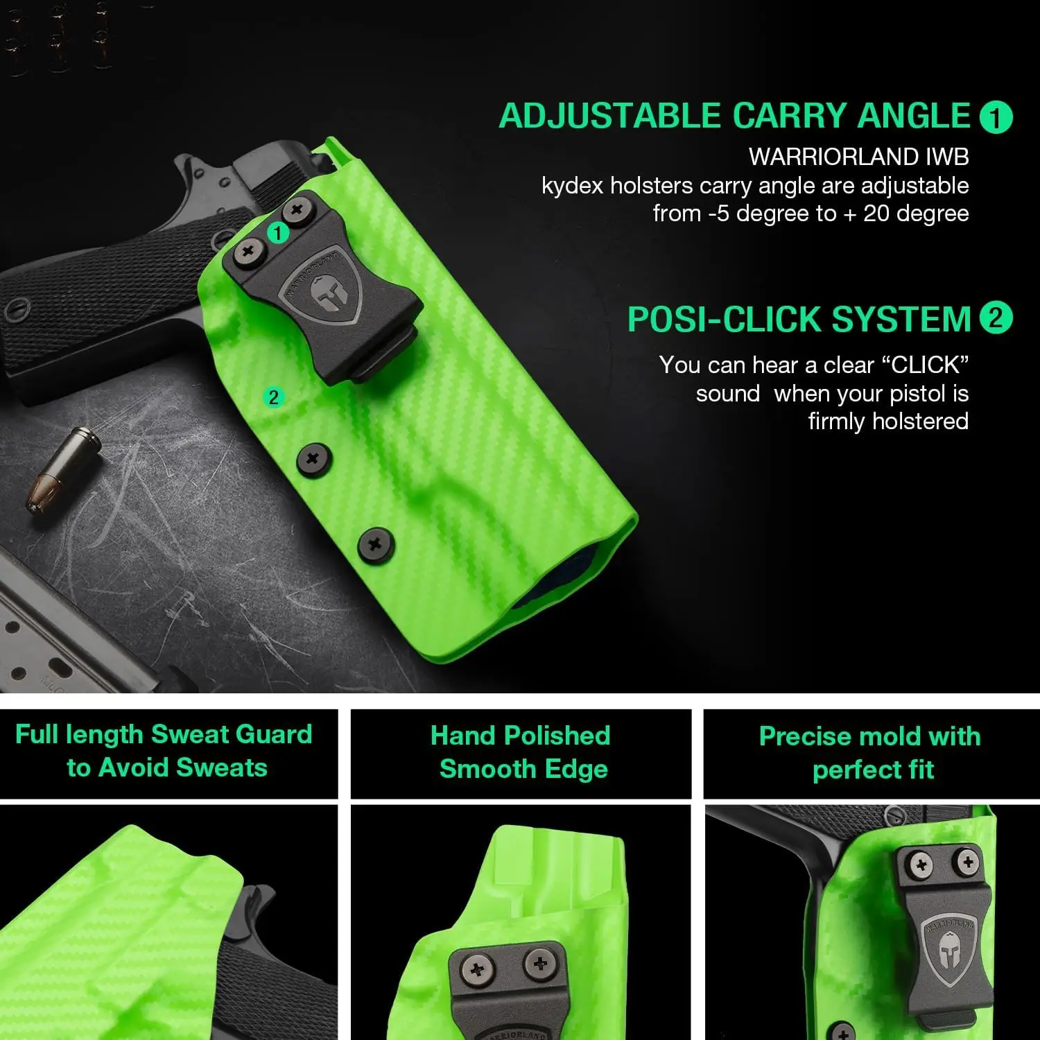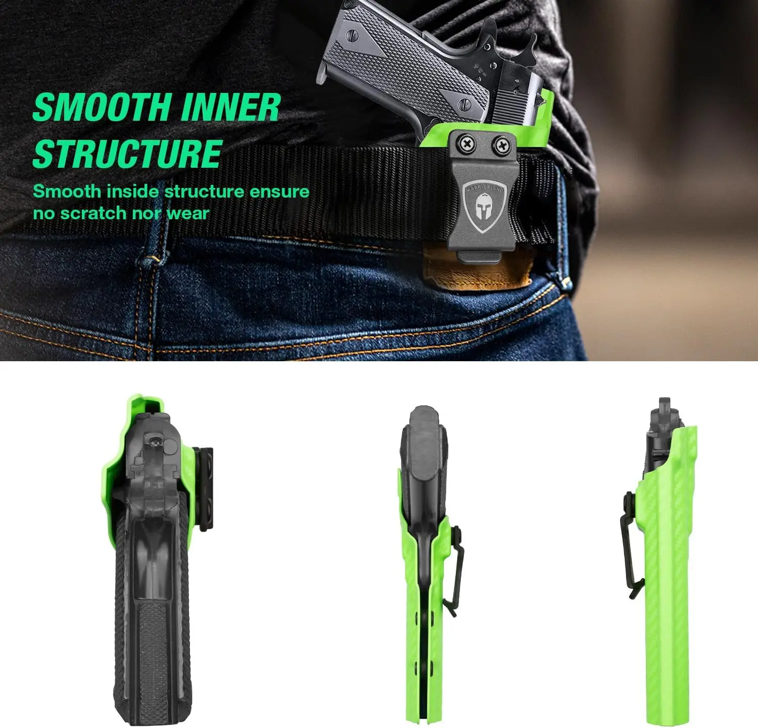 1911 sin riel : Colt 1911 .45 ACP 5 ''sin Riel, incluyendo Colt / Elite Force / Kimber / Springfield / RIA / S & W / Ruger / Taurus / Rock Island y más 1911 pistola. También es compatible con el barril de 4,5 ''o 4,25'', si puede aceptar que la funda es más larga que el barril corto (también puede cortar algo y pulir el borde)