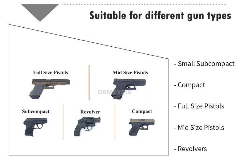 Adecuado para diferentes tipos de armas: subcompacto pequeño/compacto/pistolas de tamaño completo/pistolas de tamaño medio/revólveres