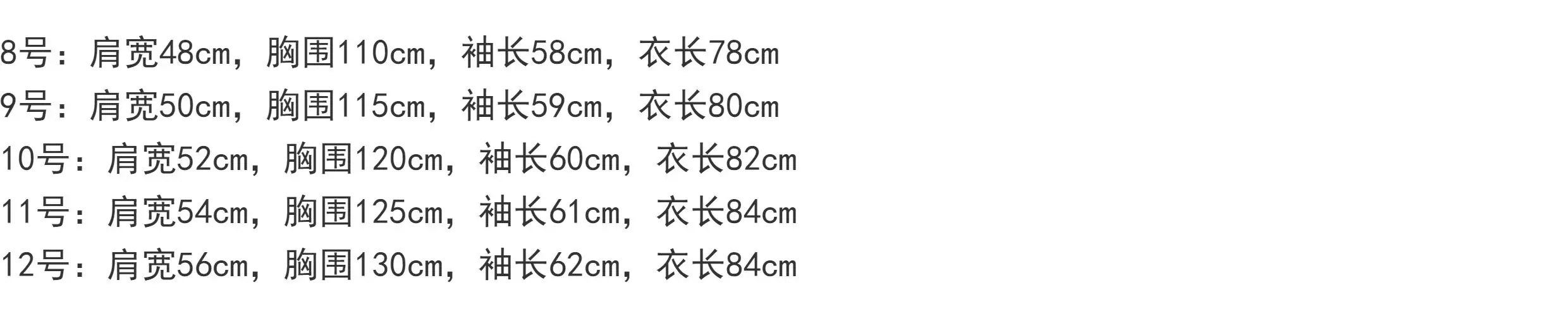 Tamaño 10: ancho de hombros 52 cm, circunferencia del pecho 120 cm, largo de la manga 60 cm, largo de la prenda 82 cm