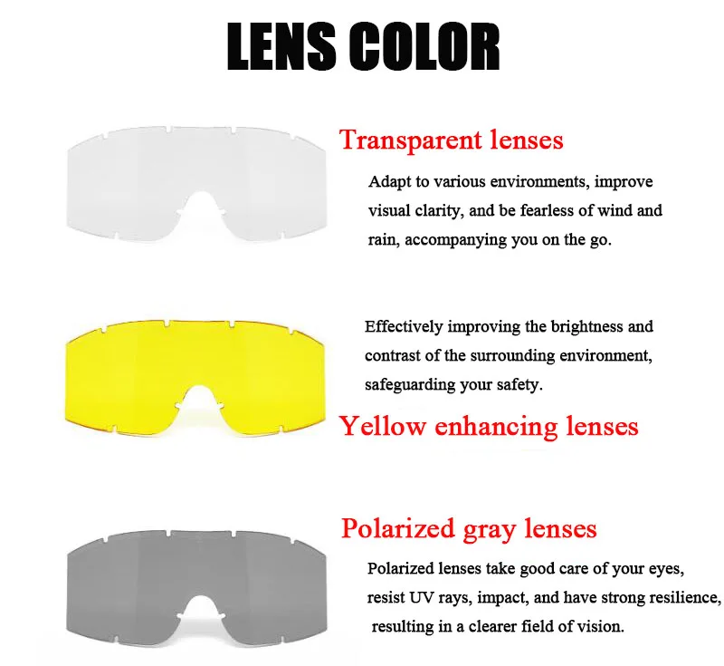 3.Color de las lentes: gris, transparente, amarillo (visión nocturna)