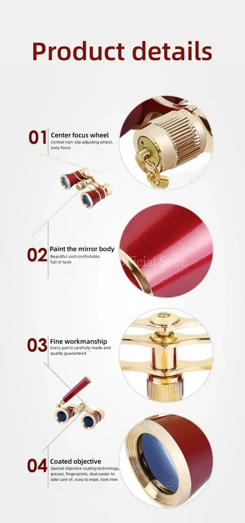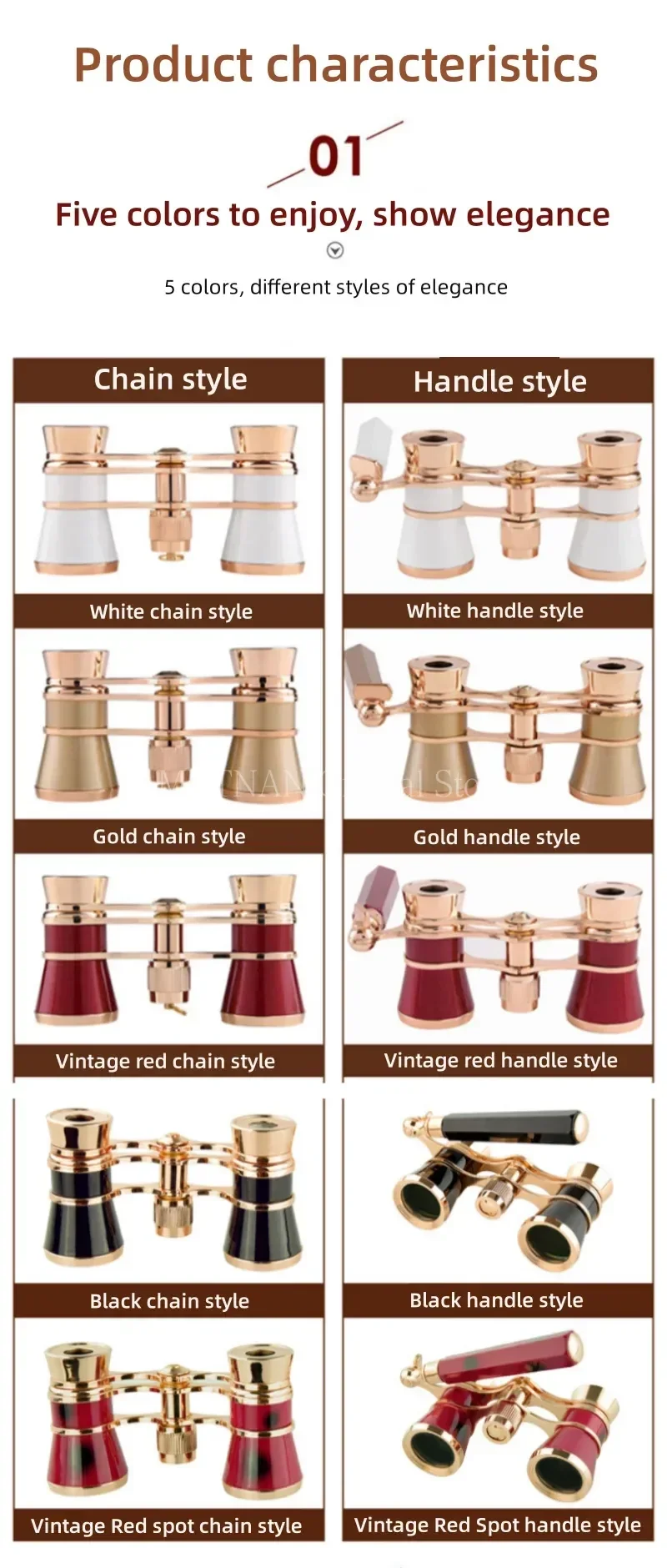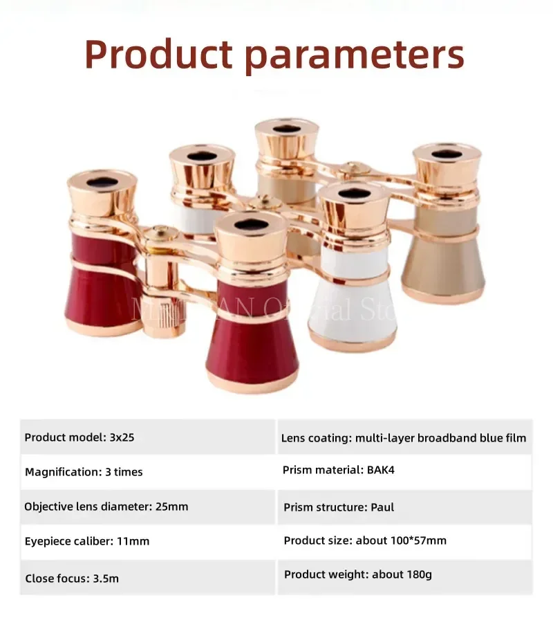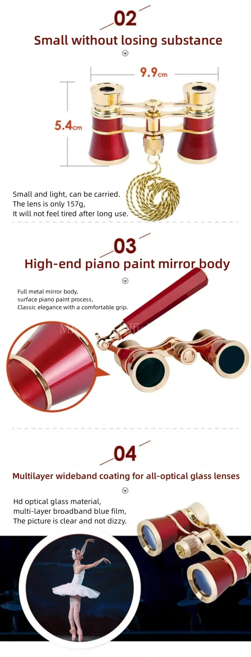 3.MATERIAL: Los binoculares de teatro están hechos de material metálico, con alta dureza y larga vida útil.Las lentes garantizan que los usuarios obtengan el mejor efecto de visualización y le proporcionen imágenes claras.