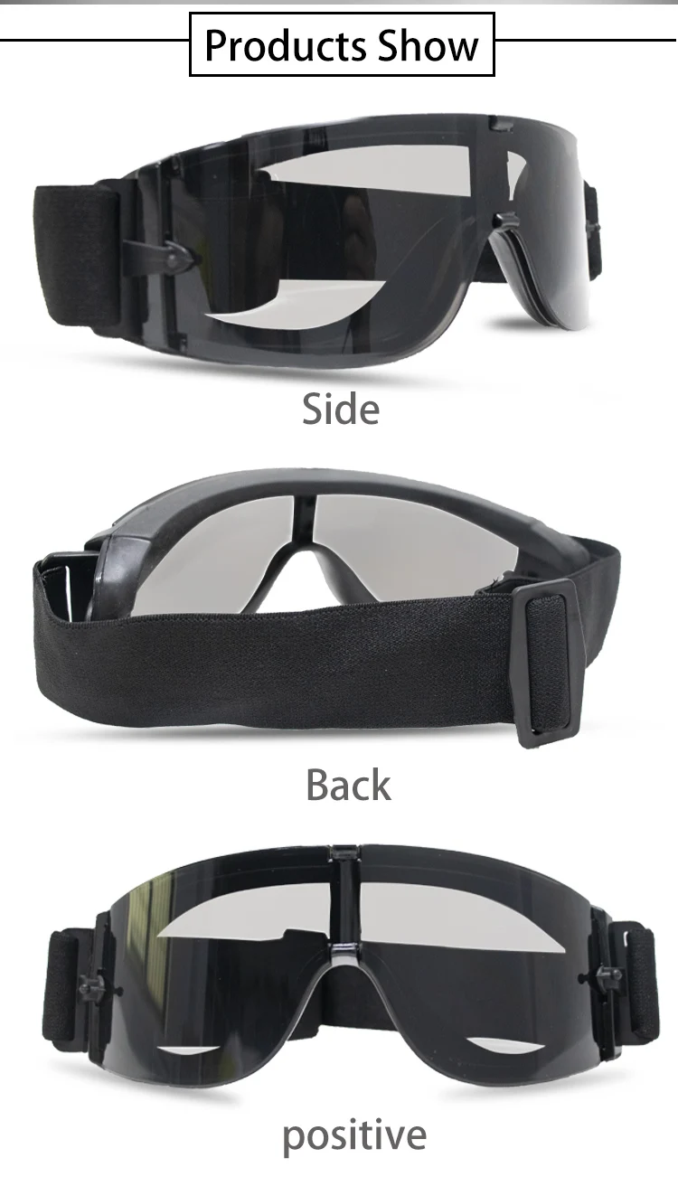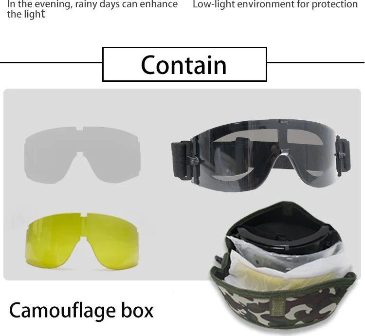 Características y Descripción:3 lentes de policarbonato de 2,2mm de grosor y alto impacto (gris, transparente, amarillo) El Marco está hecho de material BI-raw Protección UV400 Lente recubierta con revestimiento antivaho en el interior y revestimiento antiarañazos en el exterior. El marco interior está asentado con espuma suave para un uso cómodo Correa elástica hecha de fibra de nailon, 35mm de ancho y unos 40cm de largo máximo. Diseñado para uso a largo plazo y compatibilidad con el casco Ideal para actividades de juegos de guerra al aire libre. Especificaciones: Color de la lente: 3 lentes (gris + transparente + amarillo) Color de la montura: negro El paquete contiene: 3 lentes 1 x marco Cinturón deportivo Paño de limpieza Nota: Tenemos dos paquetes, uno tiene caja de camuflaje, uno sin caja. Por favor, elíjalo cuando haga el pedido. ¡Gracias!