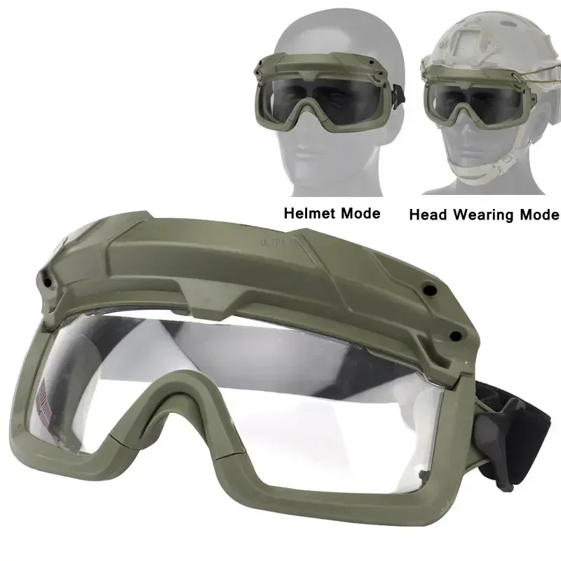 Especificaciones: ● Nombre: gafas tácticas ● Material:TPE + ABS + PC ● Tamaño: 18,5*8,5 cm ● Peso: aproximadamente 90g ● Colores: negro/Verde/bronceado/camuflaje negro/gris/camuflaje ● Dos modos de uso: modo casco/modo cabeza ● Aplicable: combate táctico, deportes de tiro de caza al aire libre.