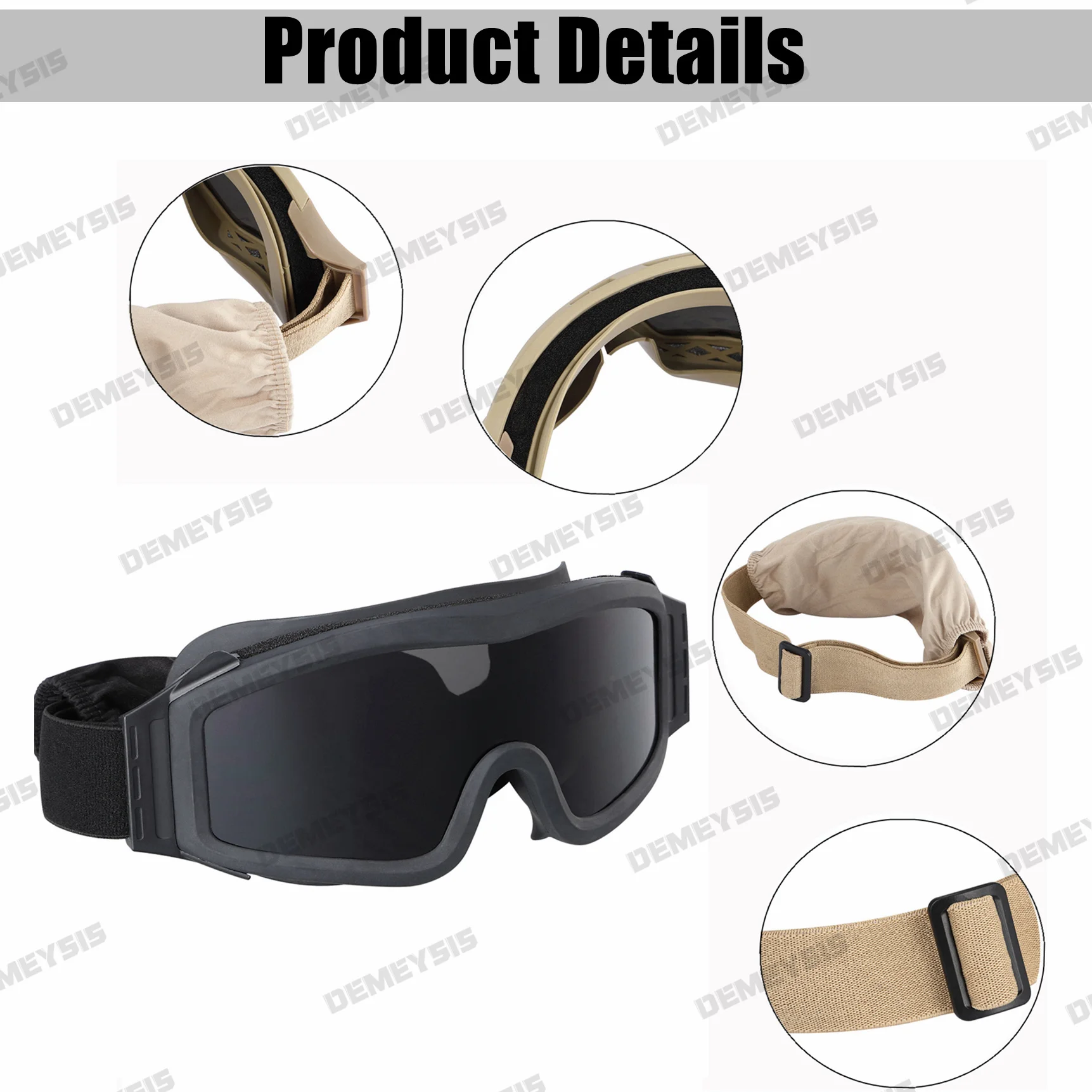 Características: *Las gafas tácticas vienen con 3 lentes intercambiables; Atributo de la lente: antiarañazos, antivaho, protección UV; *Diseño transpirable y antivaho; *Hebillas ajustables suaves y cómodas; *El marco interior está sentado con espuma suave para mayor comodidad; *Perfecto para actividades al aire libre como paintball, esquí, airsoft, equitación, ciclismo, etc.